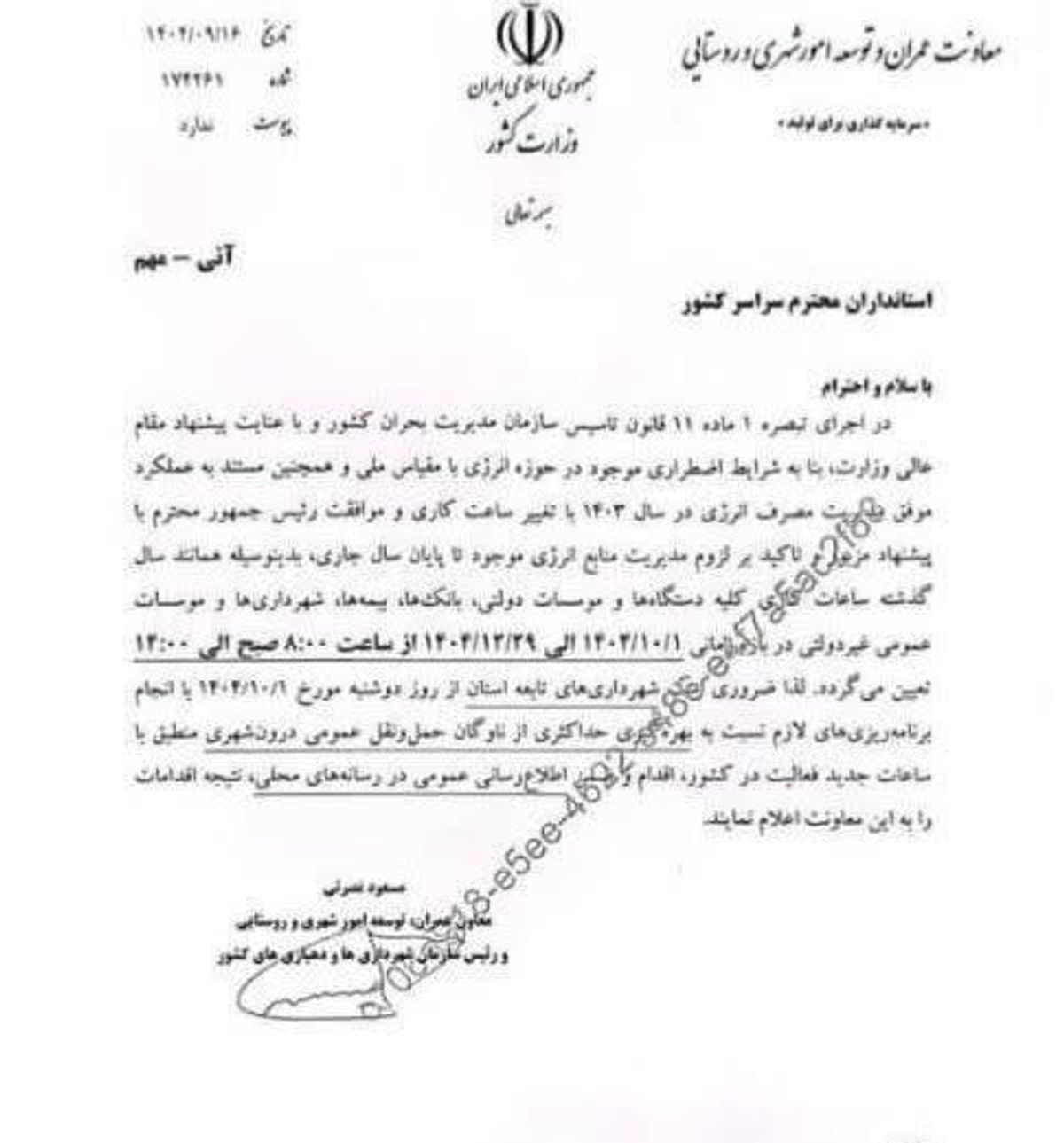 بنابر ابلاغ وزارت کشور ساعت فعالیت كليه ادارات از اول دی ماه ساعت ۸ صبح و زمان پایان فعالیت ۱۴ عصر تعیین شد.