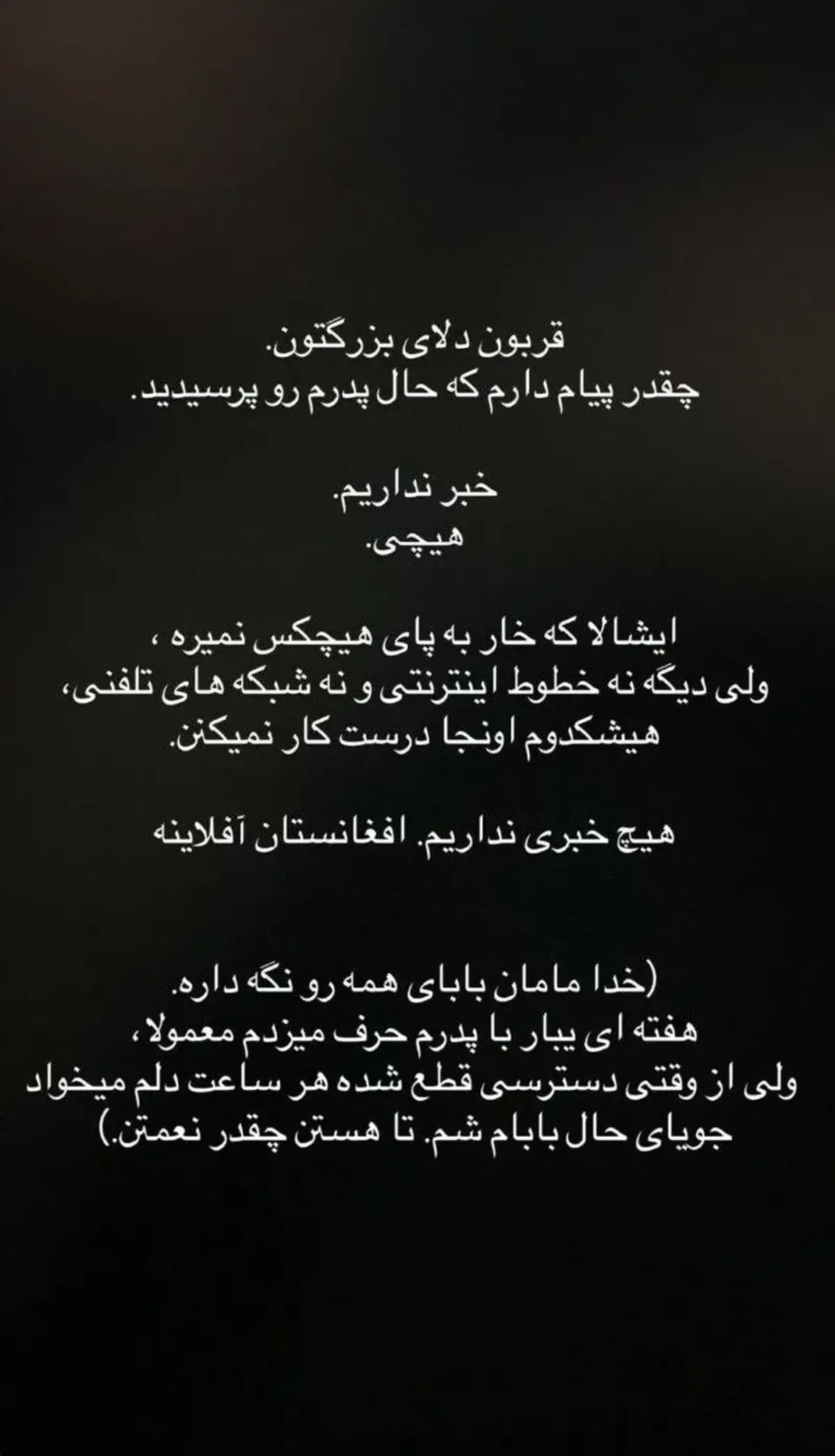 امینیتبار در جدیدترین استوری خود در فضای مجازی، نگرانی عمیقش را نسبت به حال خانوادهاش در افغانستان ابراز کرد و گفت که مدتها است از حال آنها بیخبر است. او همچنین به ارزش و نعمتی که وجود خانواده برای انسان دارد اشاره کرد و گفت: از حال پدرم بی خبرم ..خبر نداریم. ایشالا خار به پای هیچ کسی نره هیچ خبری ندریم افغانستان آفلاینه .. همیشه در هفته یک بار با او تماس میگرفتم و جویای حالش می شدم...