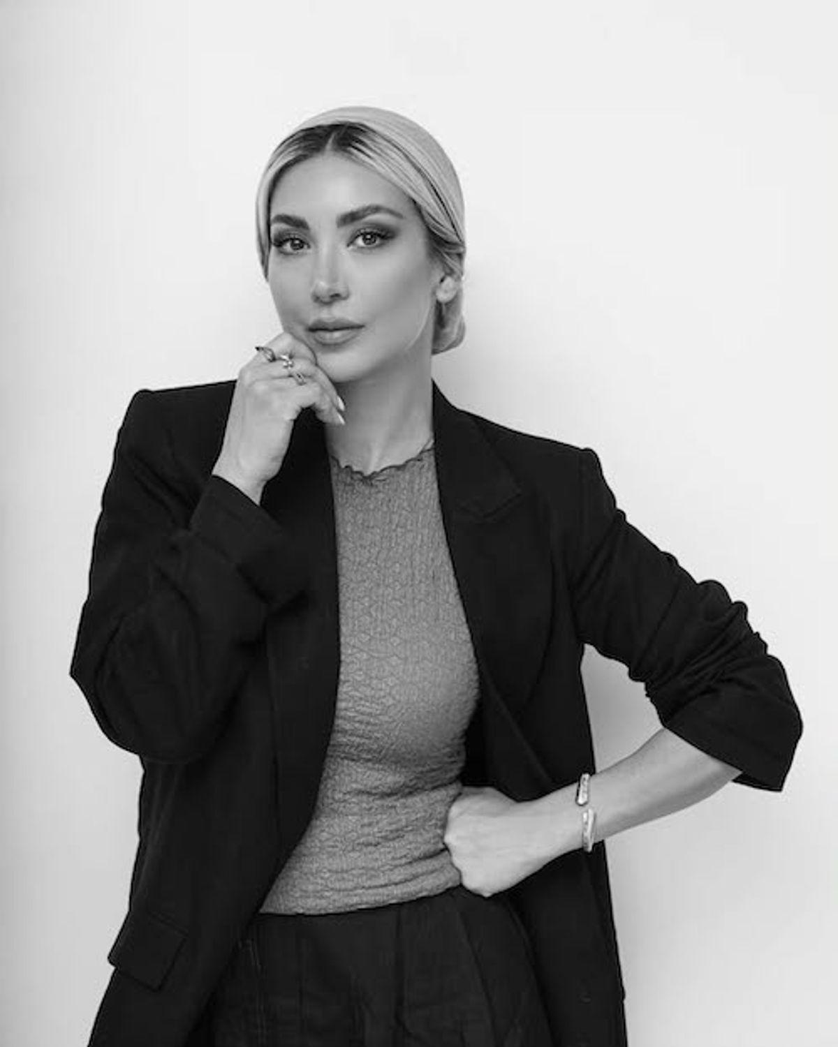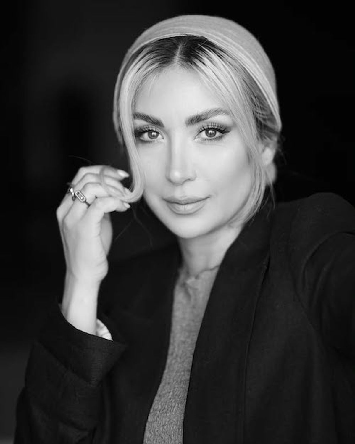 در این تصاویر، مینا با کت بلیزر مشکی و سربندی که روی موهایش قرار گرفته ظاهر شده است. این ترکیب کلاسیک و ساده، حالتی شیک و مرتب به او بخشیده و با وجود افکت سیاه و سفید، همچنان جلوهای مدرن و جذاب در تصاویر ایجاد کرده است.