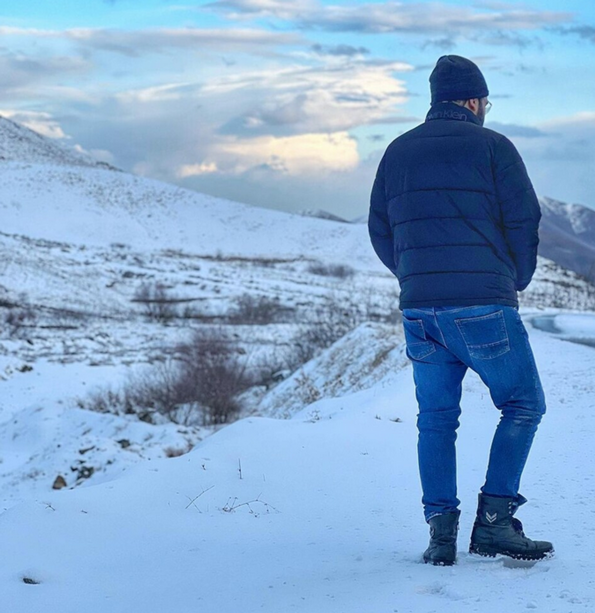 احسان علیخانی با دوستانش به ارتفاعات برفی اطراف تهران رفته است تا ورزش کند.