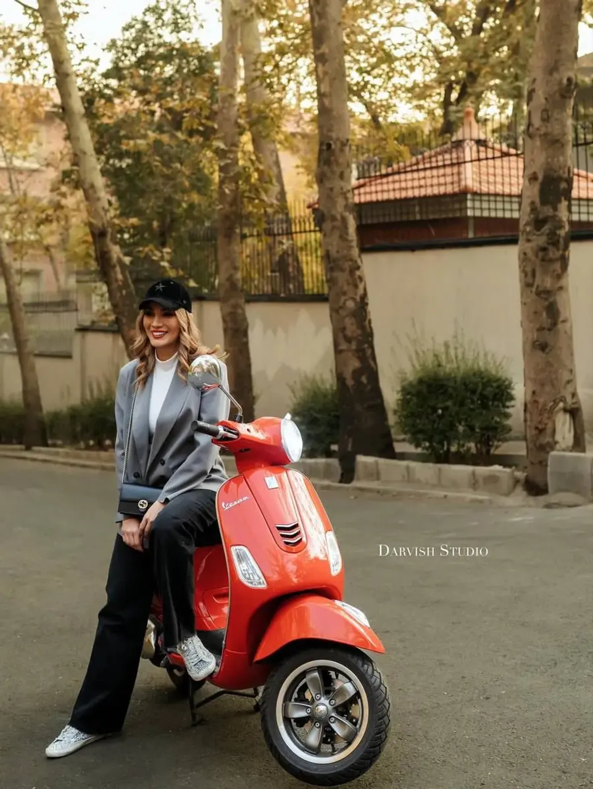 استایل شهری متین ستوده در کنار موتور وسپا در خیابانهای تهران