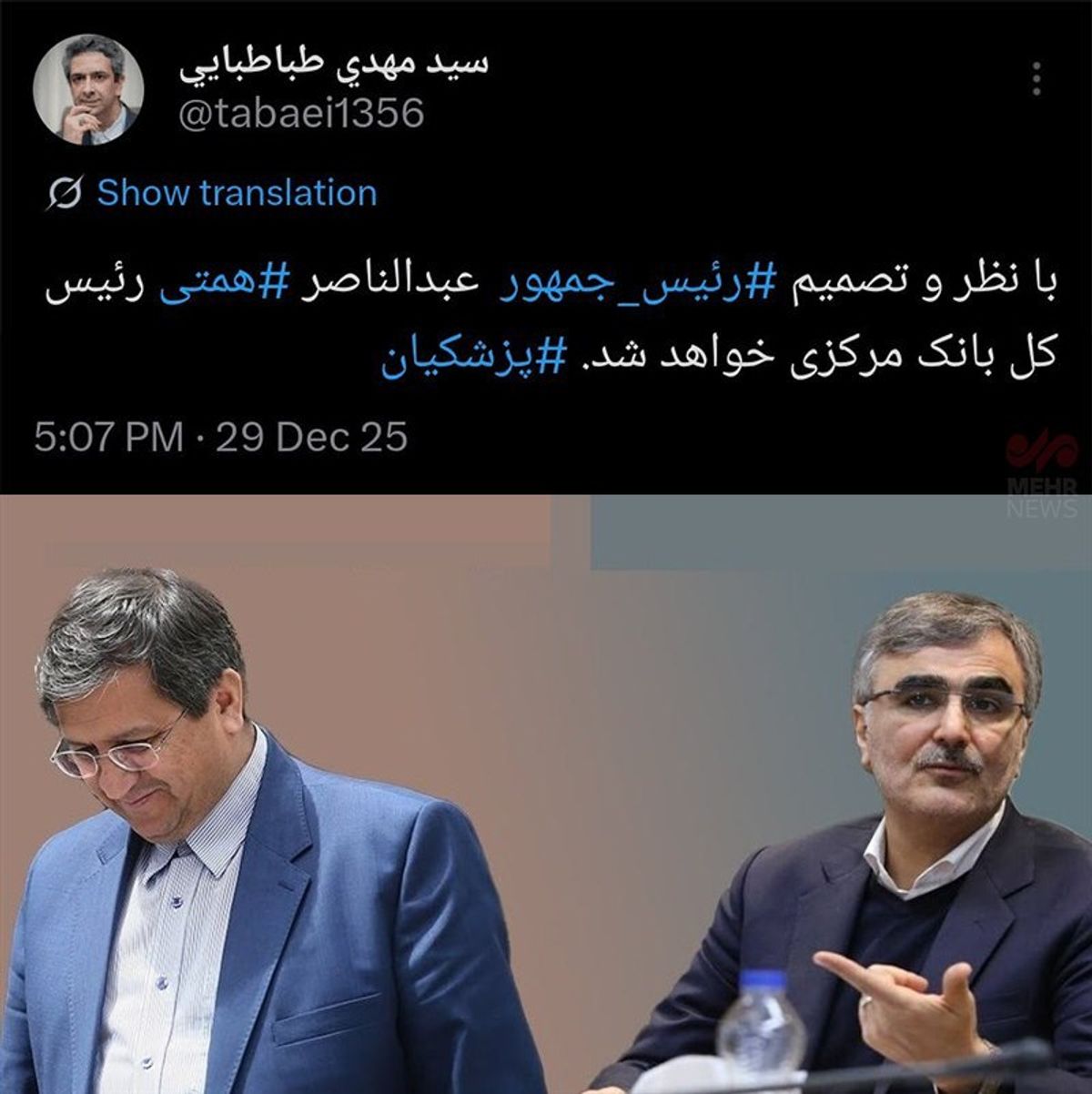 سید مهدی طباطبایی معاون ارتباطات و اطلاع‌رسانی دفتر رئیس‌جمهور در شبکه اجتماعی ایکس نوشت: ‏با نظر و تصمیم ‎رئیس جمهور عبدالناصر ‎همتی رئیس کل بانک مرکزی خواهد شد.