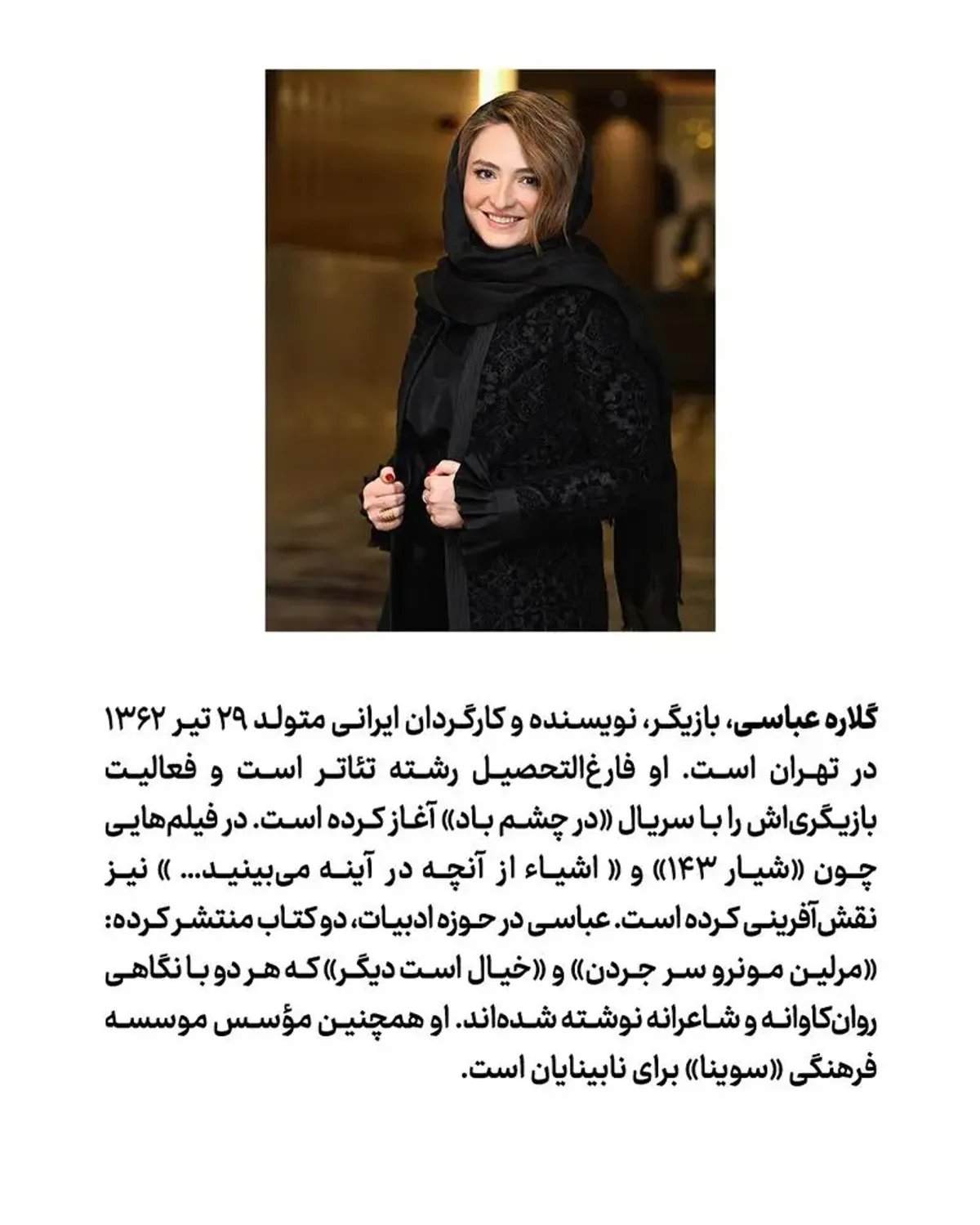 گلاره عباسی، بازیگر مطرح سینما، تئاتر و تلویزیون در ۲۹ تیرماه ۱۳۶۲ در تهران متولد شد. او فارغالتحصیل رشته تئاتر از دانشگاه هنر و معماری است و از سال ۱۳۸۰ فعالیت هنری خود را آغاز کرده است. گلاره عباسی پس از آن شرکت در کلاسهای بازیگری امین تارخ در سال ۱۳۸۲برای بازی در سریال «در چشم باد» معرفی شد و با این پروژه وارد عرصه بازیگری شد. او فعالیت سینمایی خود را با بازی در فیلم «قتل آنلاین» در سال ۱۳۸۴ آغاز کرد و در سال ۱۳۹۰ با سریال شیدایی و شهرزاد به شهرت رسید. از دیگر آثار برجسته او میتوان به فیلمهای «شیار ۱۴۳»، «نفس»، «ابلق» و «آغوش باز» اشاره کرد. گلاره عباسی در ۲۸ خرداد ۱۳۹۴ با راد ادیب ازدواج کرد اما این زندگی دوام نداشت و باطلاق خاتمه یافت.