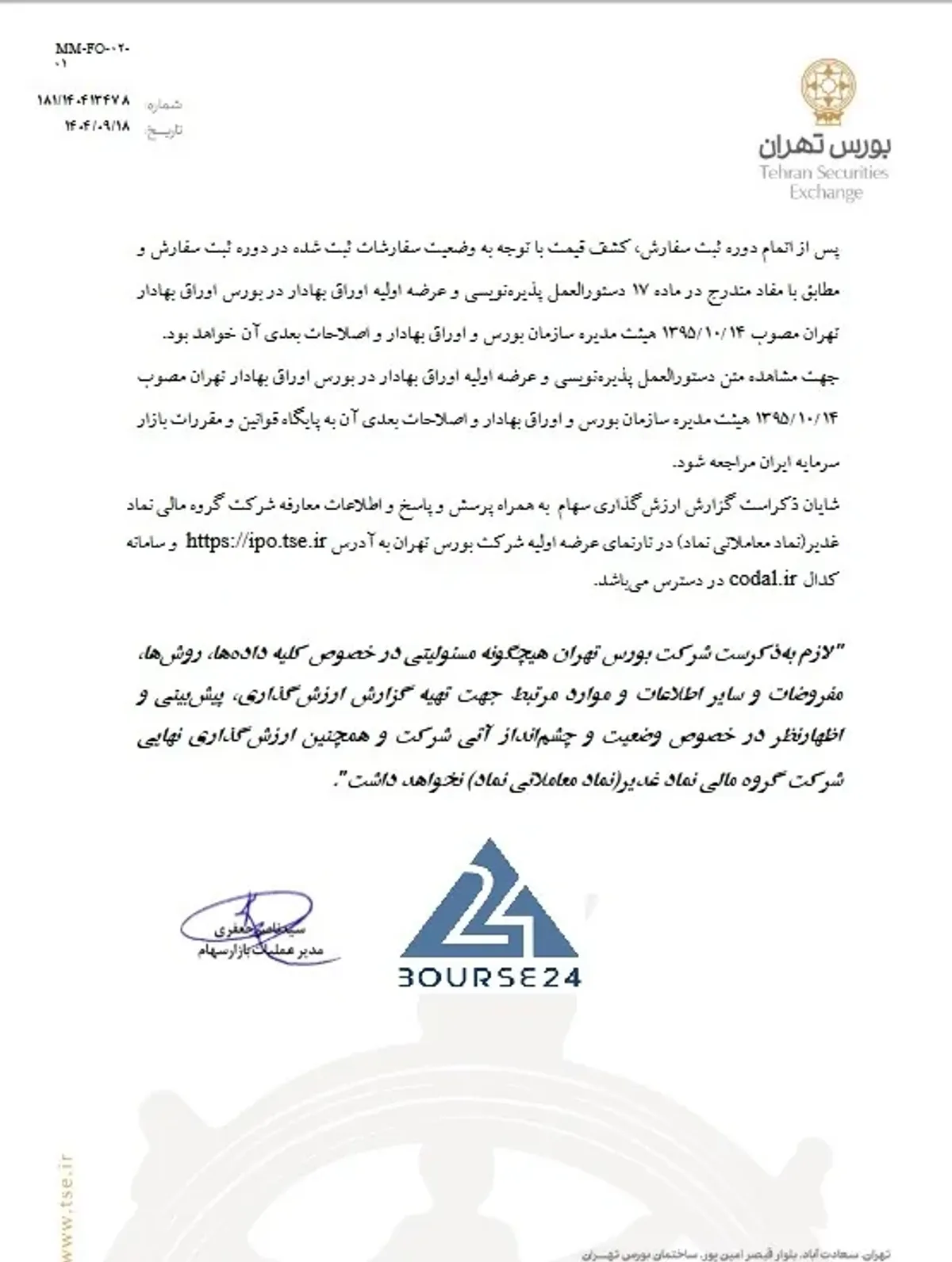 بر اساس اطلاعیه منتشر شده سقف و کف قیمت به ترتیب 2,333 ریال و 2,069 ریال تعیین شده است و مدیر عرضه کارگزاری آزمون بورس می باشد.