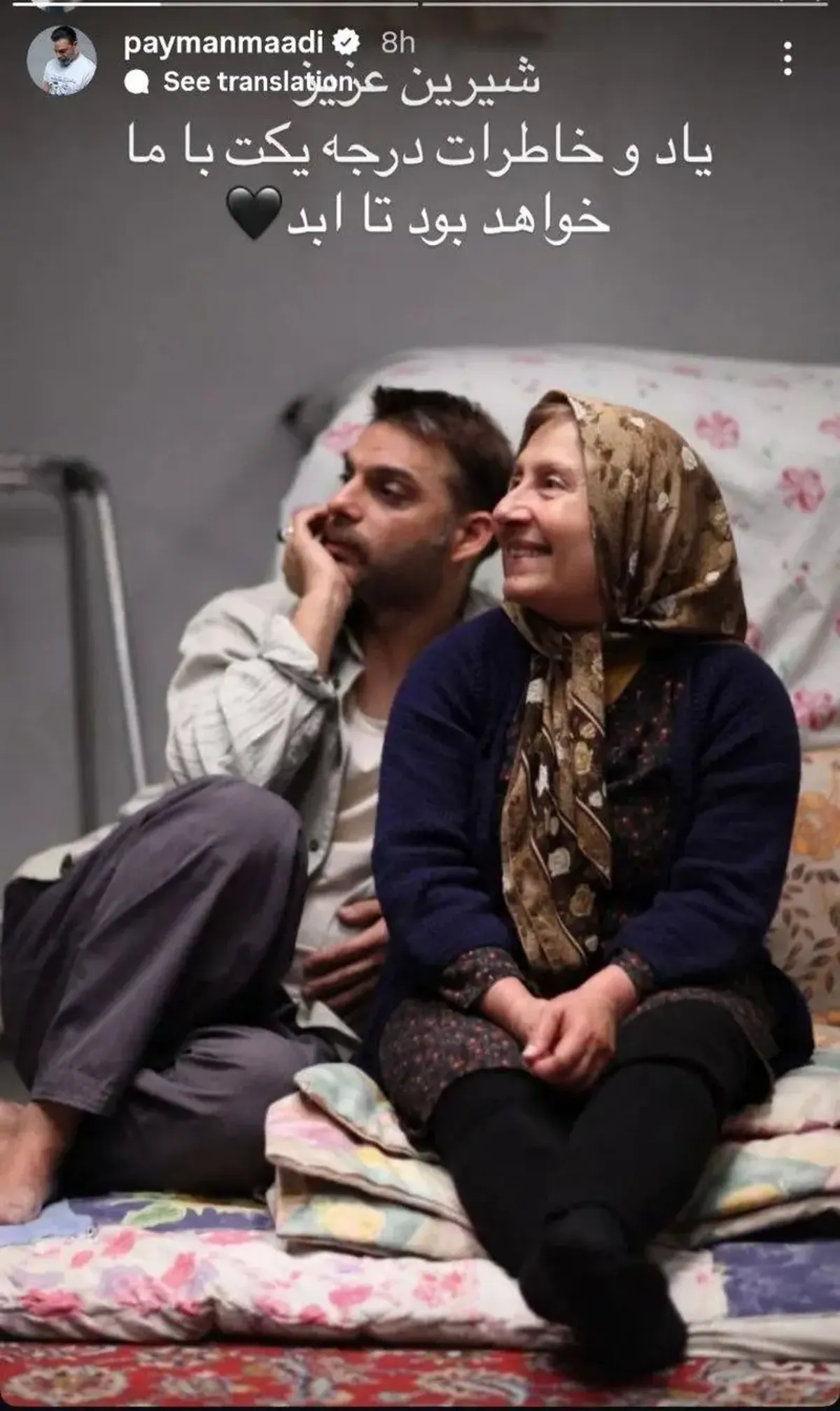 پیمان معادی در پی درگذشت شیرین یزدانبخش، بازیگر پیشکسوت سینما، استوری احساسی منتشر کرد. این دو هنرمند پیش از این در کنار هم در فیلم سینمایی «ابد و یک روز» بازی کرده بودند.