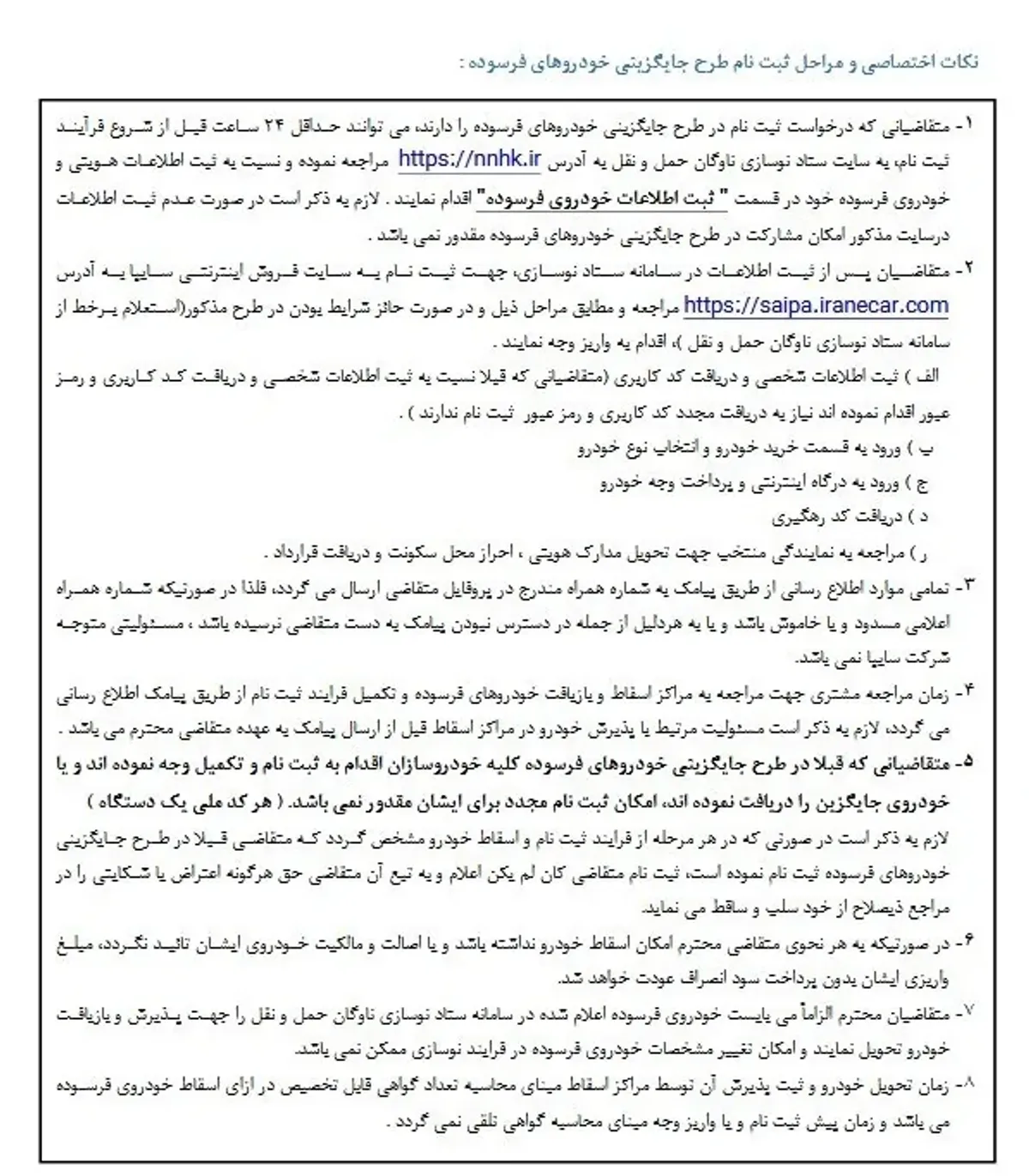 متقاضیانی که درخواست ثبت نام در طرح جایگزینی خودروهای فرسوده را دارند، میتوانند حـداقل 24 سـاعت قبـل از شـروع فرآینـد ثبت نام، به سامانه ستاد نوسازی ناوگان حمل و نقل به نشانی nnhk.ir مراجعه و نسبت به ثبت اطلاعـات هـویتی و خودروی فرسوده خود در قسمت ” ثبت اطلاعات خودروی فرسوده” اقدام کنند.