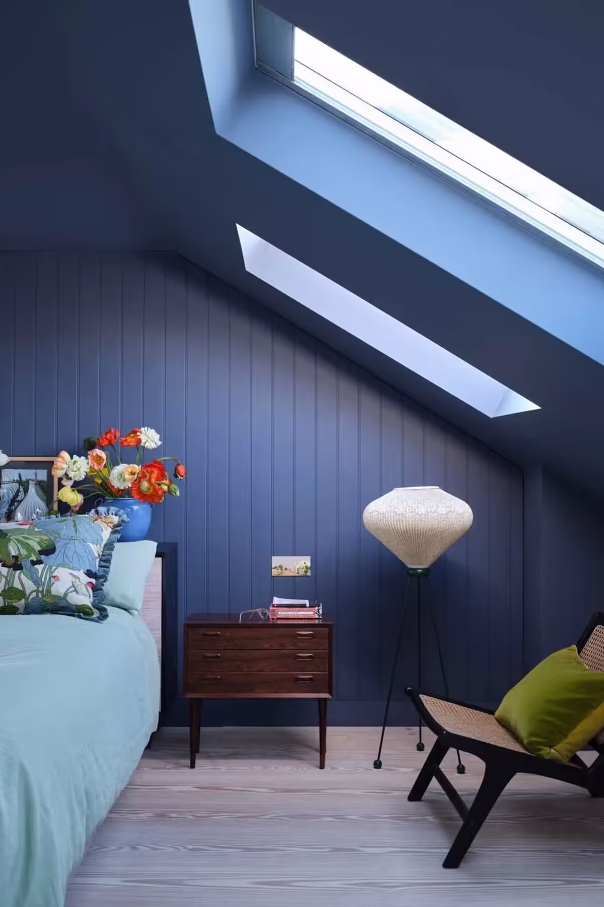 همانطور که در این نمونه میبینید، این رنگ در اتاقهای زیرشیروانی بسیار خوب عمل میکند، جایی که سقفهای شیبدار ممکن است کمی فشارآور به نظر برسند.