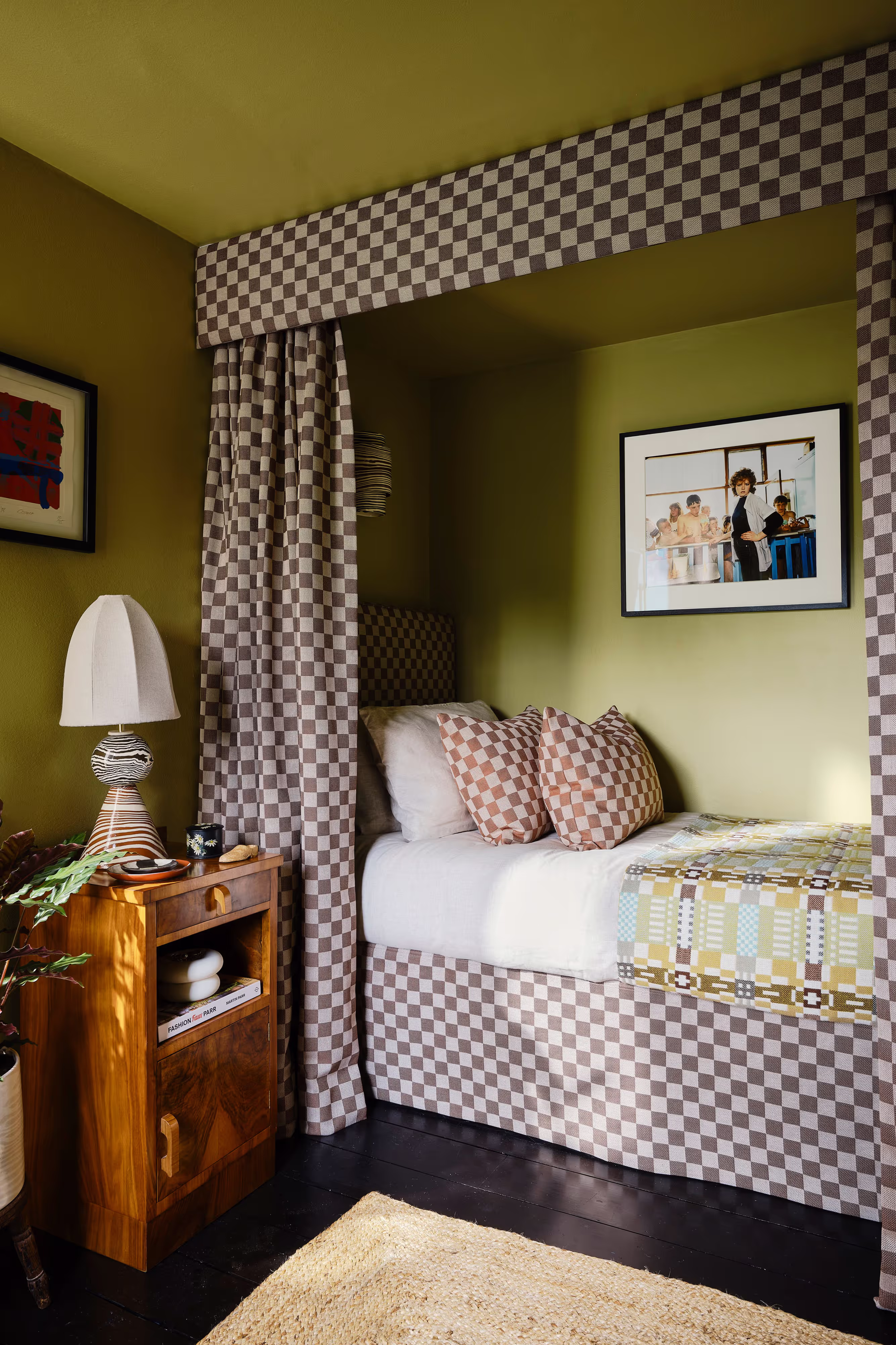 پارچهی چهارخانه Henry Holland Blenets بهطرز فوقالعادهای مانع یکنواختی بلوک سبز شده و جلوهای زیبا به فضا میبخشد.