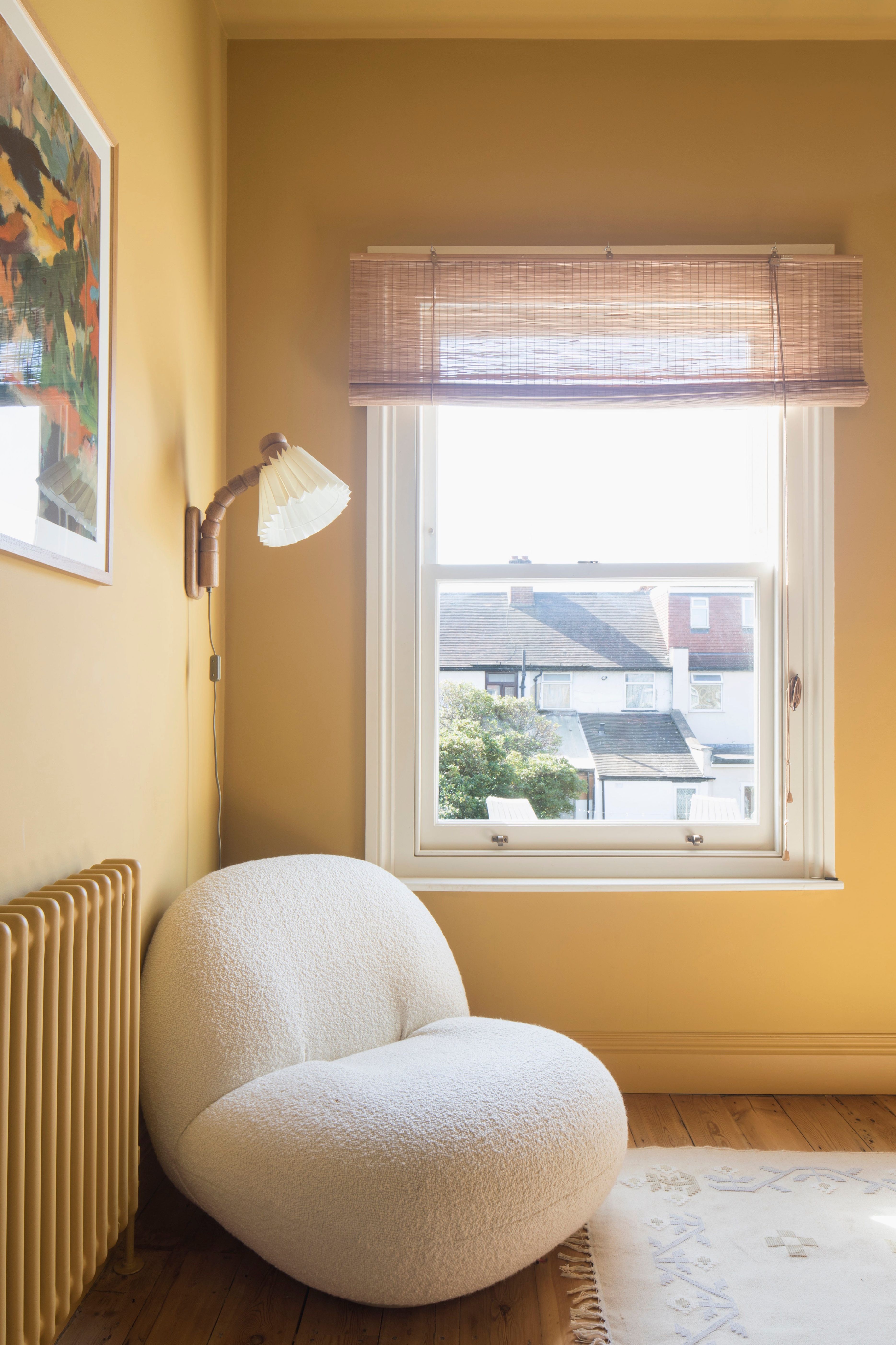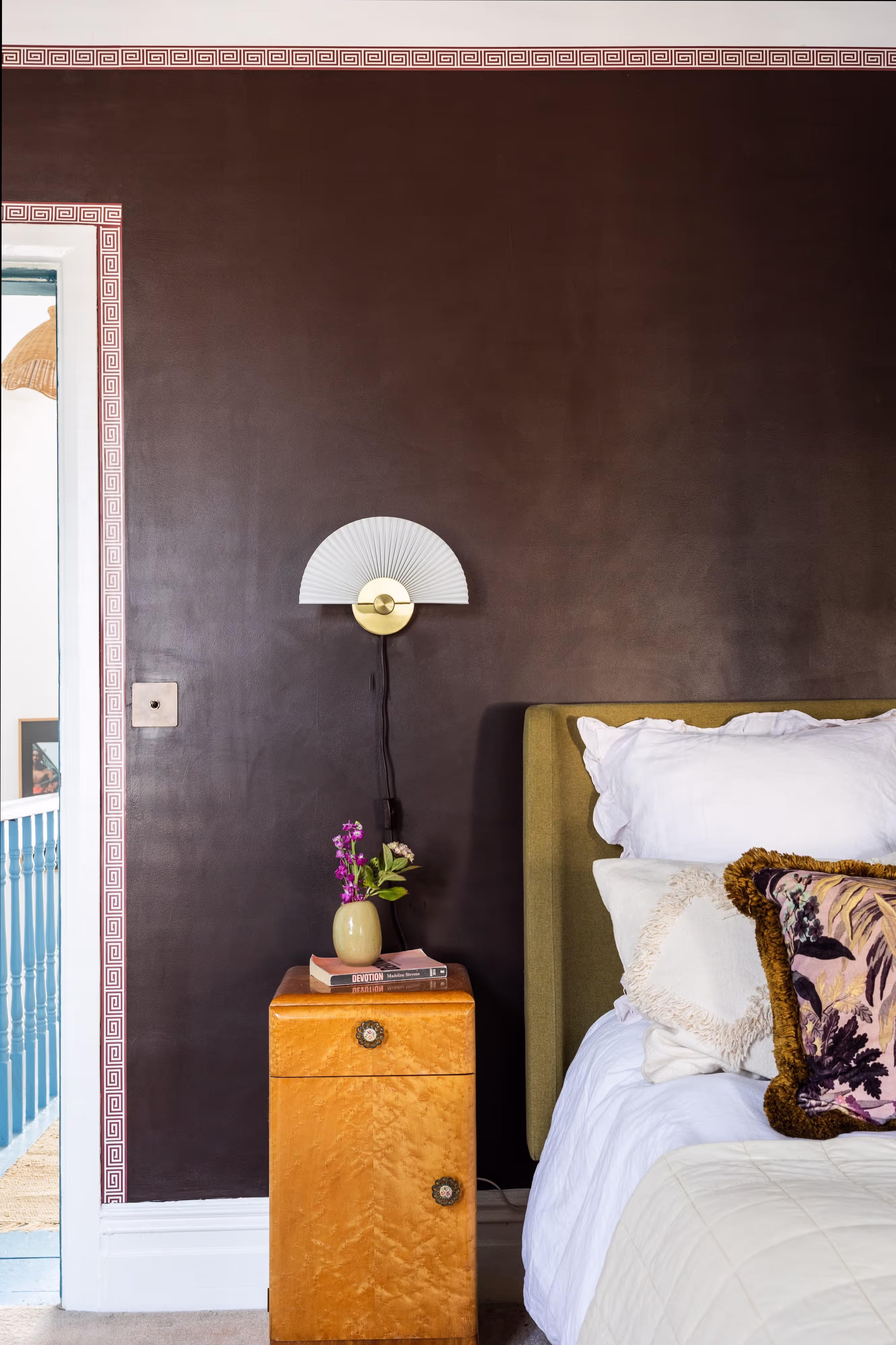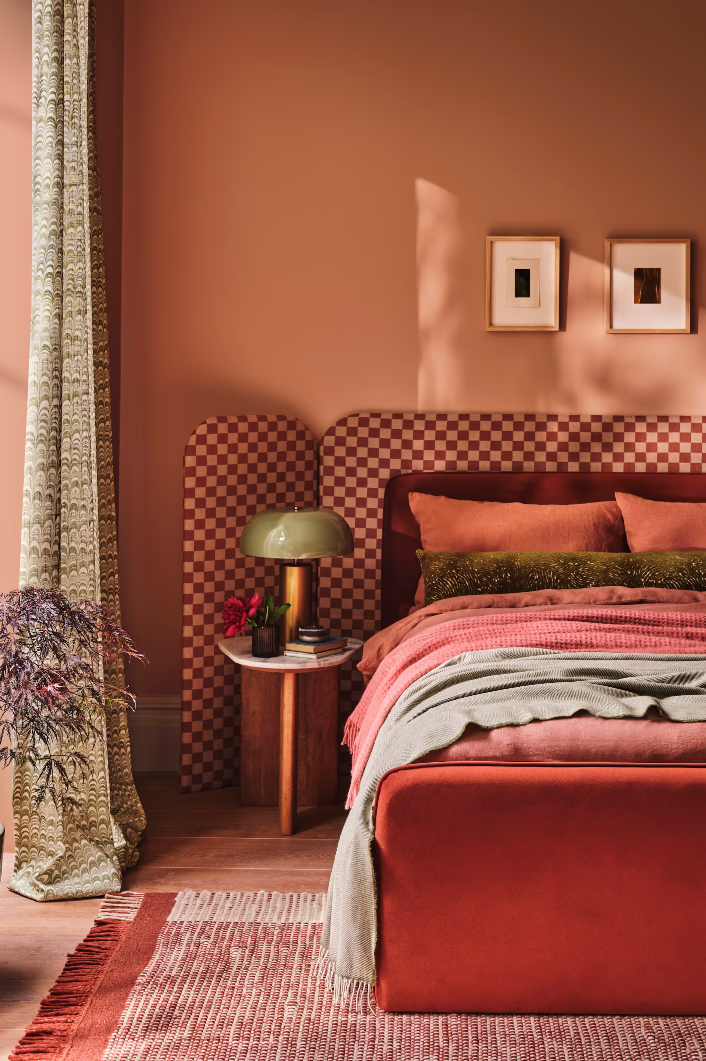 اتاقهای خواب کوچک از حس صمیمیت و دنجی بهره میبرند و این حس میتواند با رنگ اُخر گرم و روشن ایجاد شود. آن را با سقف سفید ترکیب کنید تا فضا تعریف پیدا کند، یا مانند طراحی امیلی پَن، رنگ را تا سقف ادامه دهید اگر میخواهید اتاق حس دنجتر و محصورتری داشته باشد.
