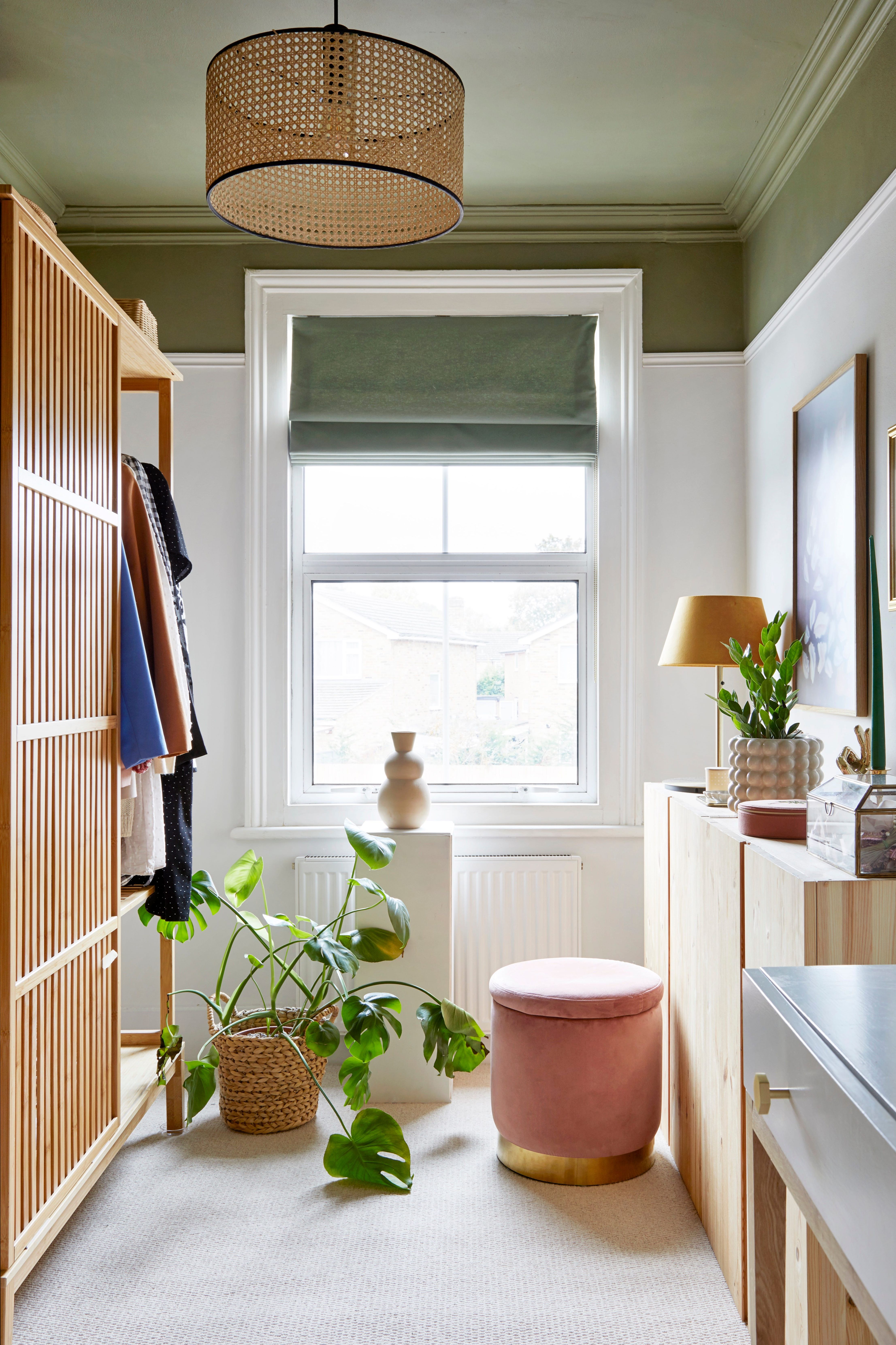 برای جلوگیری از فشرده شدن فضا، رنگ را با خطوط عمودی بشکنید. در این نمونه، پردهها این کار را انجام دادهاند، اما قاب در رنگ شده یا حتی یک کتابخانه باریک هم میتواند همین اثر را داشته باشد.