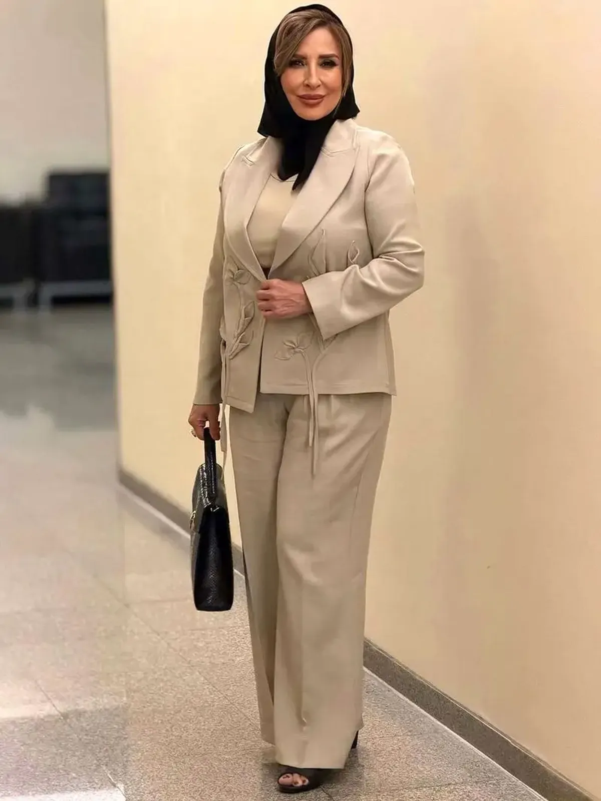 مرجانه گلچین، بازیگر پیشکسوت سینما، در کنسرت احسان نیزن با یک استایل رسمی و خاص حضور یافت. او کت و شلوار بژ رنگی با تکهدوزیهای هنری به شکل گل را با کیف پوستماری مشکی ست کرده بود.