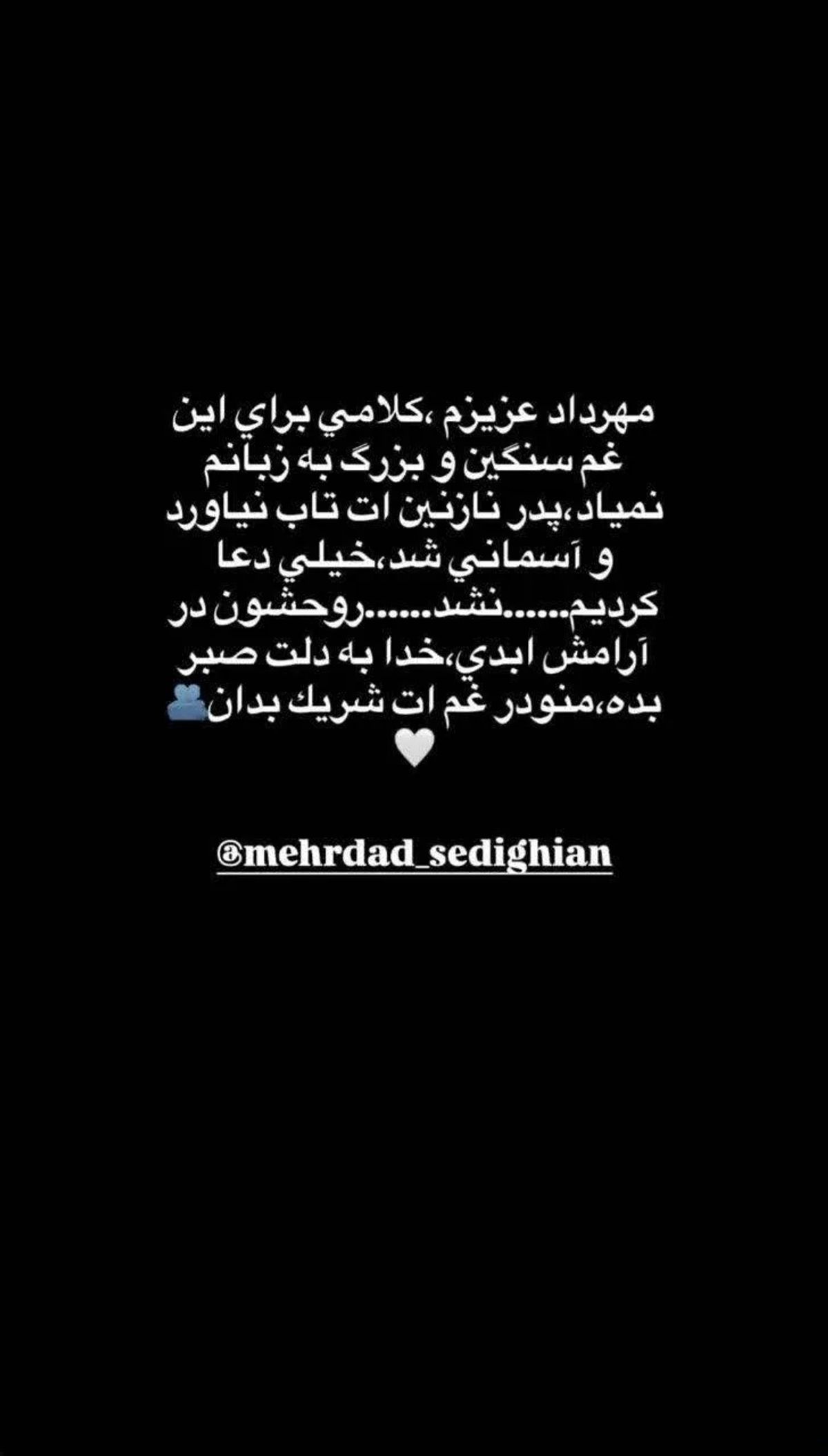 سمیرا حسنپور، بازیگر جوان و بااستعداد کشورمان که تجربه همکاری با صدیقیان را در فیلم «ساعت ۶ صبح» به کارگردانی مهران مدیری دارد، واکنشی سریع و احساسی نشان داد. او با انتشار استوری در صفحه شخصی اش نوشت: «مهرداد عزیزم، کلامی برای این غم سنگین و بزرگ به زبانم نمیاد. پدر نازنین ات تاب نیاورد و آسمانی شد، خیلی دعا کردیم….. نشد….. روحشون در آرامش ابدی، خدا به دلت صبر بده، منو در غم ات شریک بدان.»
