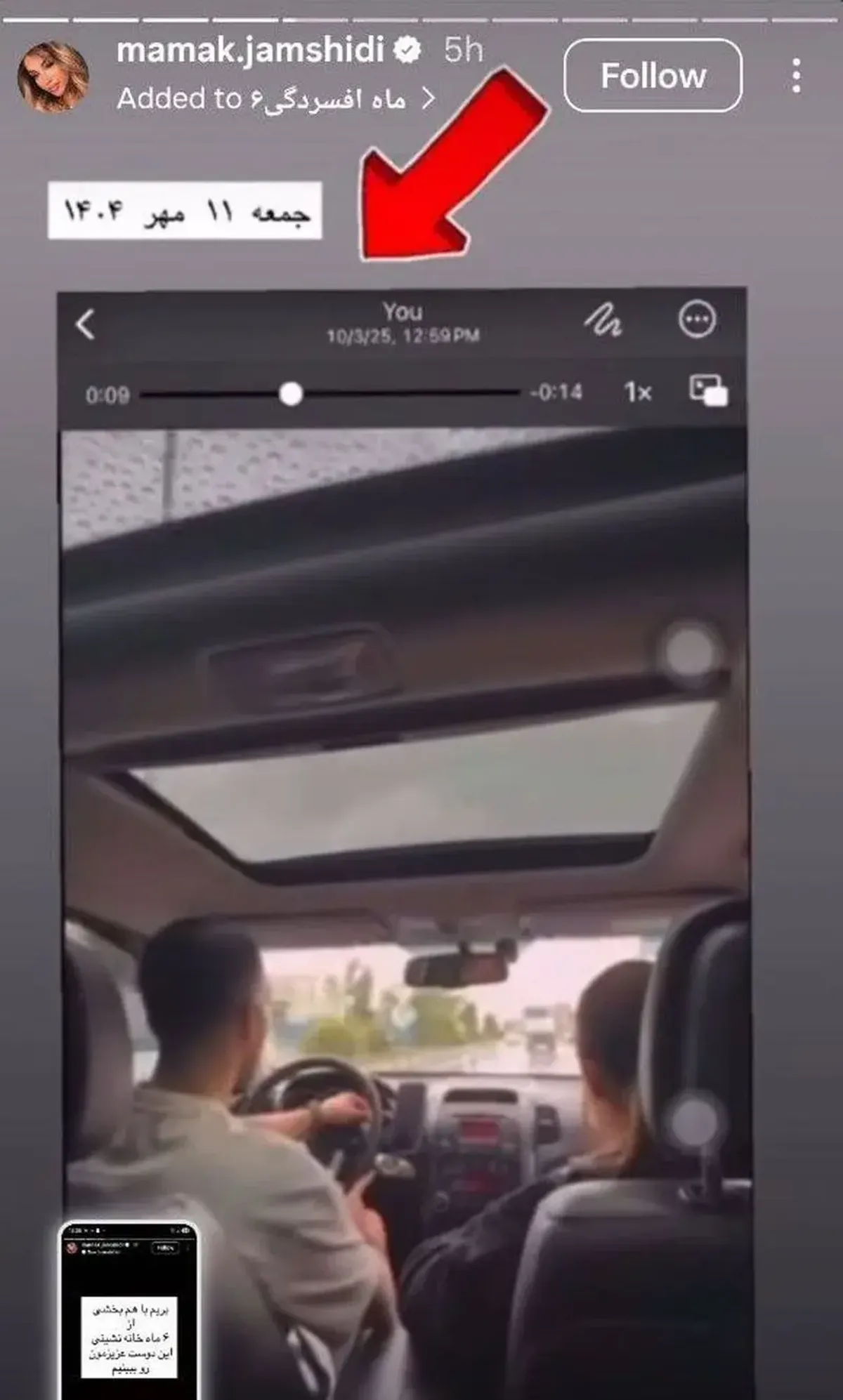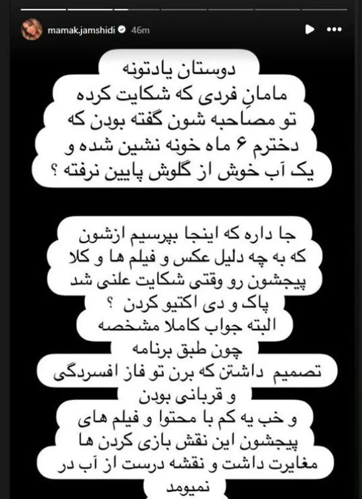 در یکی از این استوریها، مامک جمشیدی نوشته است: «خانم قربانی طفلک نه خواب داشته نه خوراک». همچنین او با اشاره به صفحه شاکی، اضافه کرده: «بریم با هم بخشی از ۶ ماه خانهنشینی این دوست عزیزمون رو ببینیم».