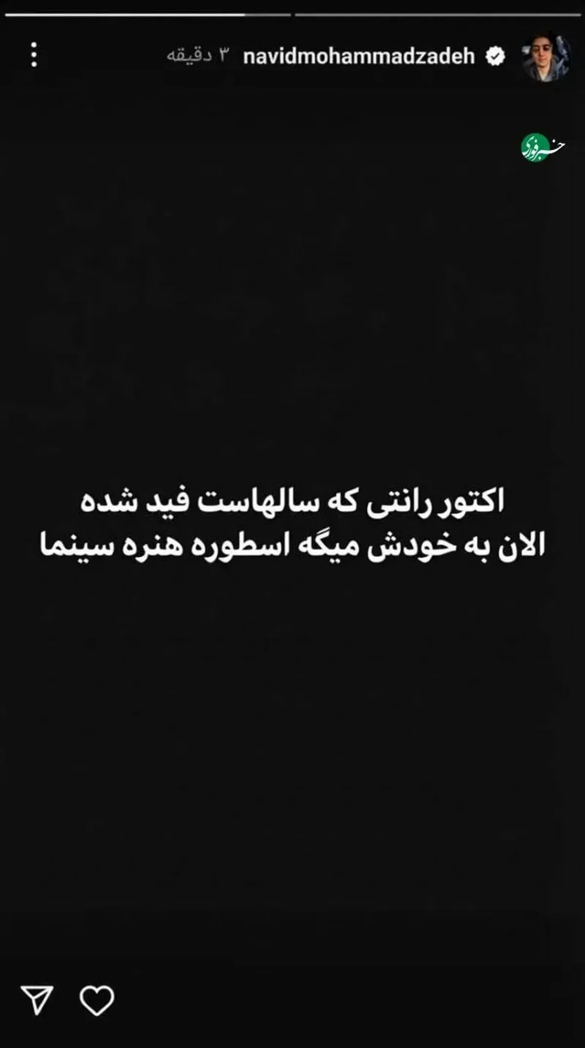 در این استوری، او یک متن از صفحه خبرفوری را ریاستوری کرده بود که نوشته بود: «اکتر رانتی که سالهاست فید شده الان به خودش میگه اسطوره هنر سینما». این جمله کوتاه اما تند، خیلی سریع واکنشهای گستردهای در شبکههای اجتماعی به دنبال داشت و گمانهزنیها درباره پاسخ غیرمستقیم نوید محمدزاده به صحبتهای ترانه علیدوستی را بالا برد.