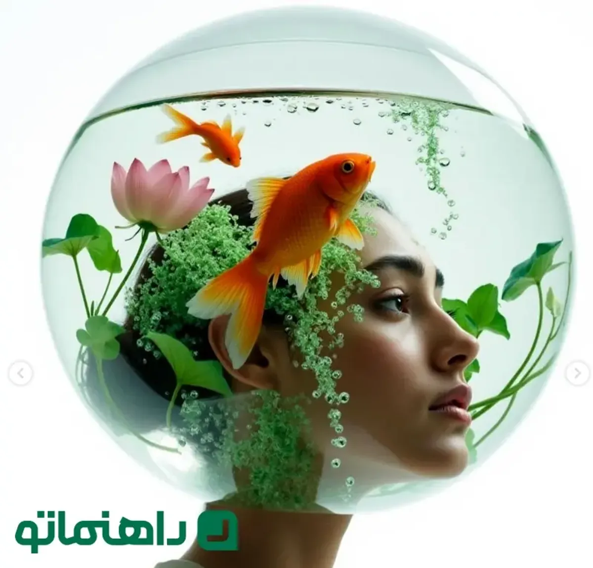 در تصویر چهارم، او با کلاهی شبیه به یک آکواریوم پر از ماهیهای قرمز و نیلوفرهای آبی، به نماد ماهی نوروزی و زندگی اشاره دارد.