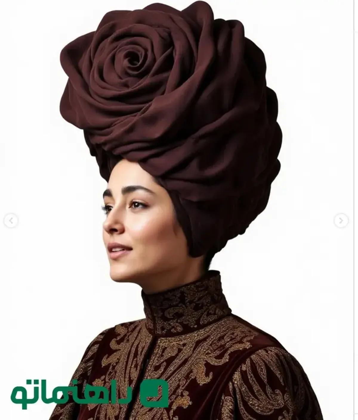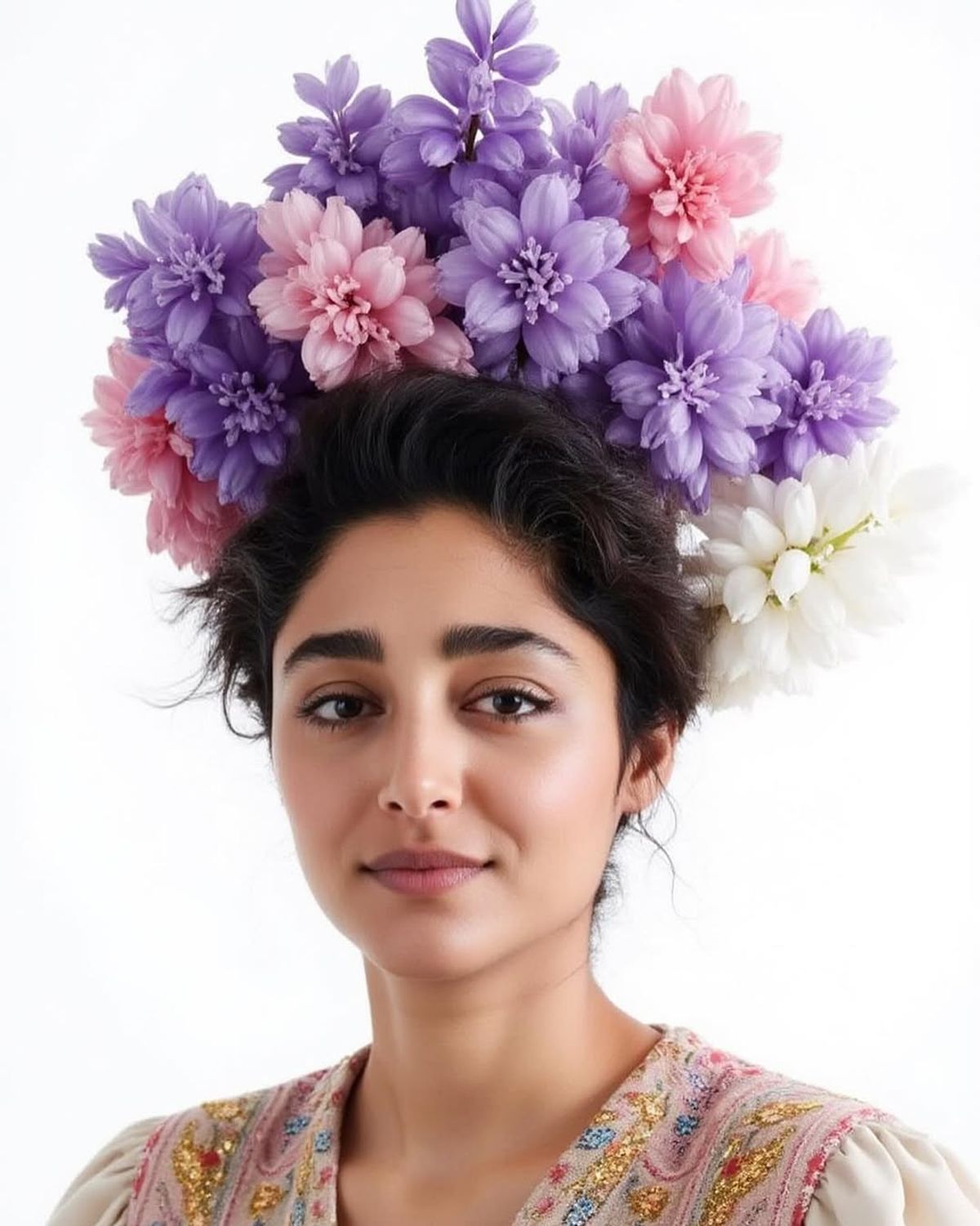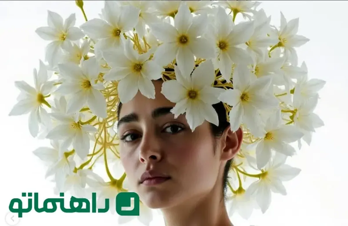 در تصویر اول، او با کلاهی از گلهای سفید و ظریف که یادآور سنبل (یکی از اجزای هفتسین) است، حس تازگی و بهار را منتقل میکند.