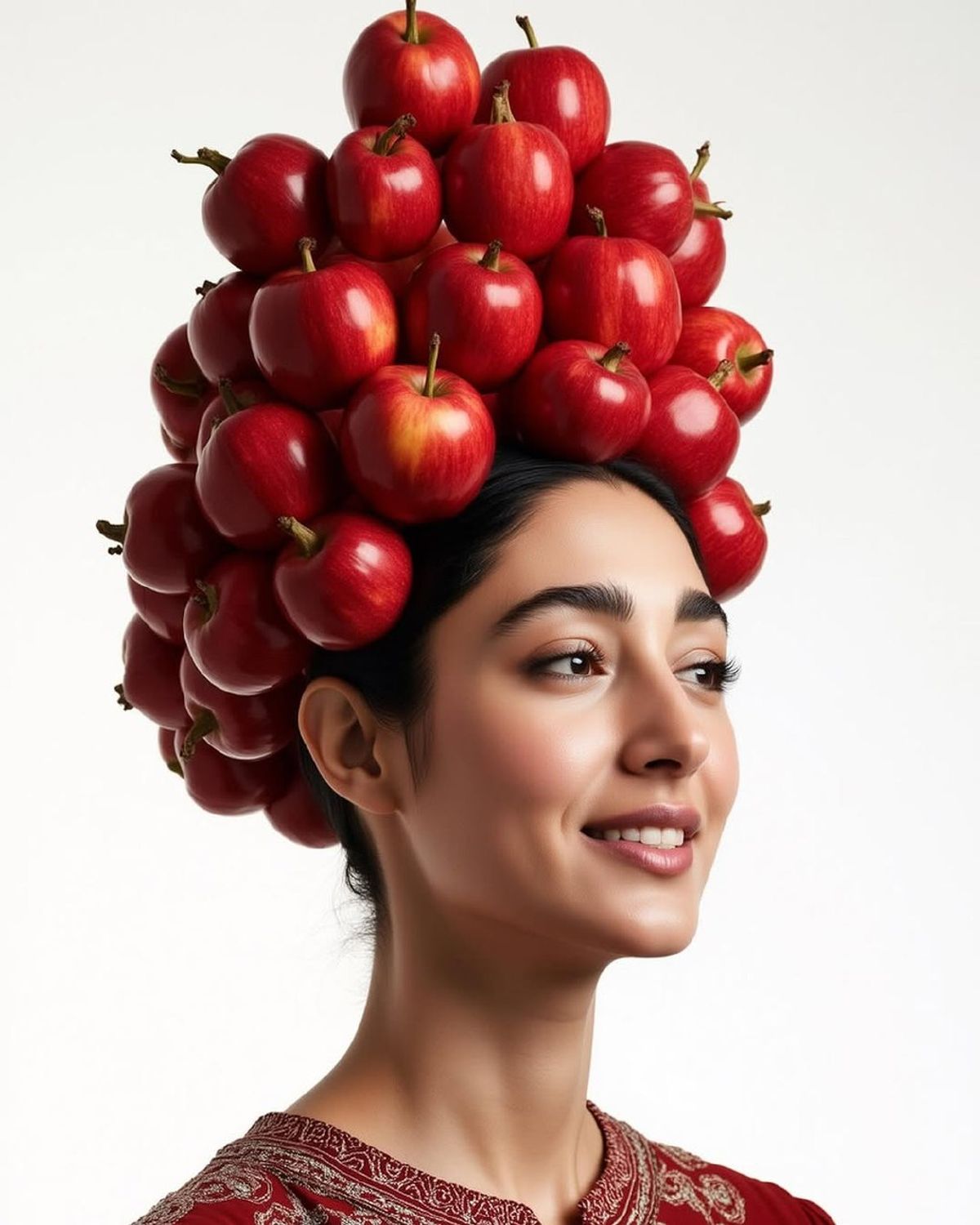 در تصویر دوم، کلاهی از سیبهای سرخ و براق، نماد سیب را به شکلی جسورانه و جذاب به نمایش میگذارد.