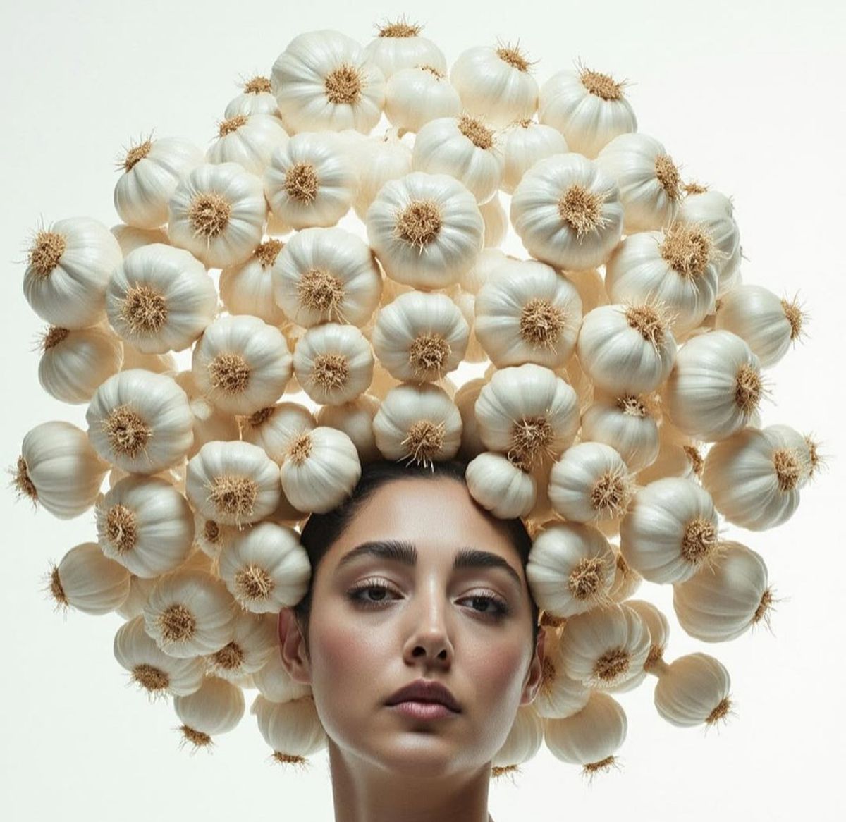 تصویر سوم با کلاهی از سیرهای سفید، نماد سیر را با طنزی ظریف و در عین حال زیبا نشان میدهد.