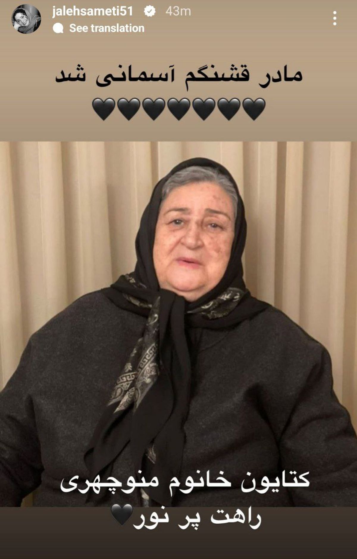 ژاله صامتی، بازیگر سینما با انتشار یک استوری، از درگذشت مادرش خبر داد.