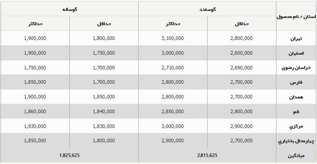 در استان خراسانرضوی هم قیمت هر کیلو گوسفند زنده بین ۲۶۰ تا ۲۷۵ هزار تومان و هر کیلو گوساله زنده ۱۸۰ تا ۱۹۰ هزار تومان اعلام شد. در استان فارس نیز قیمت هر کیلو گوسفند زنده ۲۷۰ تا ۲۸۰ هزار تومان و گوساله زنده ۱۷۰ تا ۱۸۵ هزار تومان است.