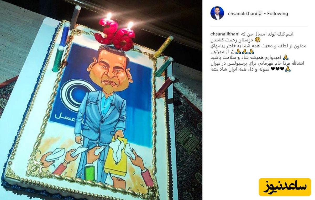 احسان علیخانی که زمانی که 36 ساله شده است، تصویری از کیک تولدش را در اینستاگرام منتشر کرد که روی آن با غم انگیز بودن برنامههای «ماه عسل» شوخی کرده بودند.علیخانی در توضیح این پست اینستاگرامی نوشت: «اینم کیک تولد امسال من که دوستان زحمت کشیدن، ممنون از لطف و محبت همه شما به خاطر پیامهای پُر از مهرتون امیدوارم همیشه شاد و سلامت باشید، انشالله فردا جام قهرمانی برای پرسپولیس در تهران بمونه و دل همه ایران شاد بشه.»