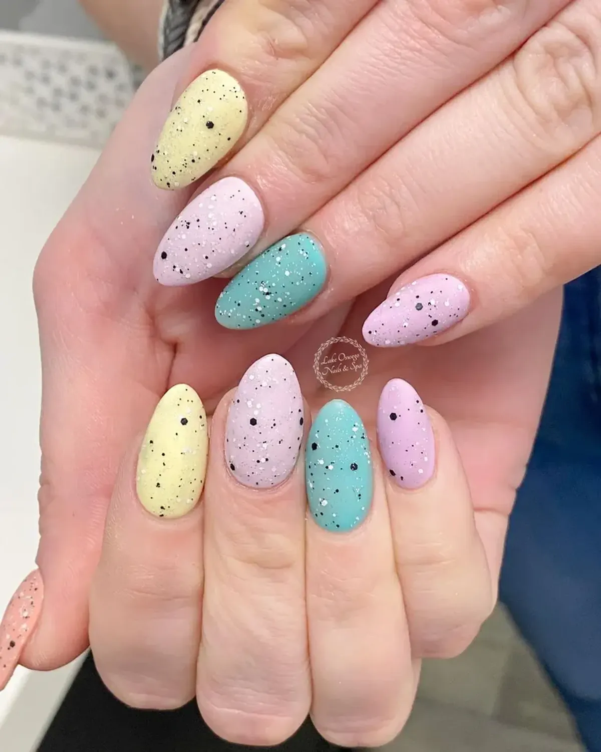 اگرچه ممکن است آبی در نگاه اول انتخاب واضحی برای طراحی ناخن عید پاک نباشد، هانا میگوید که این رنگ کلاسیک عید پاک است و "بهزیبایی با سایر رنگهای پاستلی و خنثی ترکیب میشود." او همچنین سبز نعنایی را گزینهای عالی برای این فصل میداند: "این رنگ، حس آرامش و طبیعت را به ناخنهای شما میافزاید و انتخابی ظریف و هماهنگ با استایل عید پاک است.