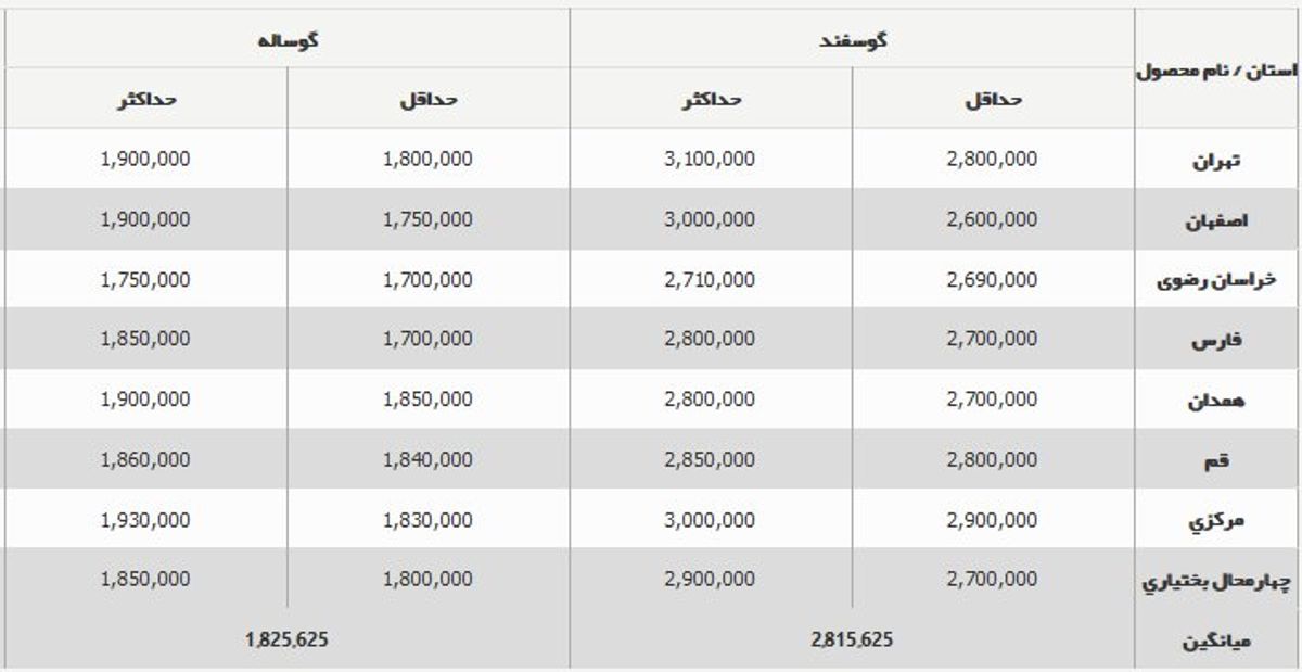 در استان خراسانرضوی هم قیمت هر کیلو گوسفند زنده بین ۲۶۹ تا ۲۷۱ هزار تومان و هر کیلو گوساله زنده ۱۷۰ تا ۱۷۵ هزار تومان اعلام شد. در استان فارس نیز قیمت هر کیلو گوسفند زنده ۲۷۰ تا ۲۸۰ هزار تومان و گوساله زنده ۱۷۰ تا ۱۸۵ هزار تومان است.