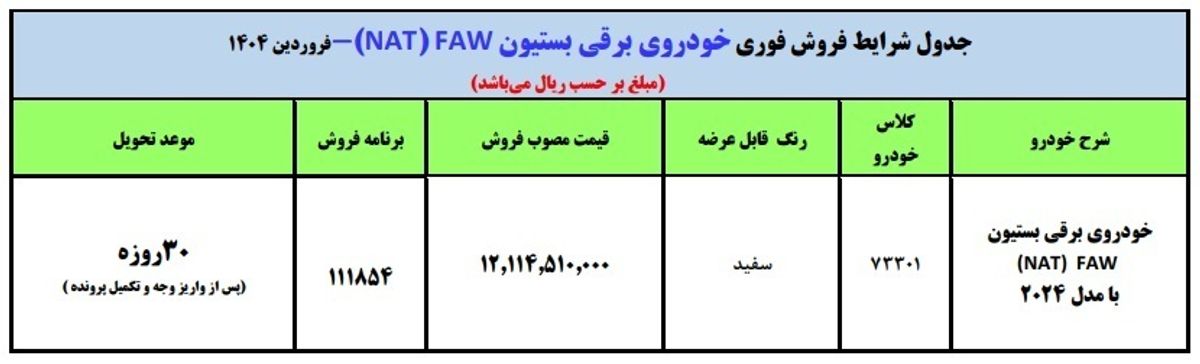 اولین طرح فروش ایران خودرو در سال ۱۴۰۴ برگزار می شود. به اطلاع عموم متقاضیان محترم و نمایندگیهای مجاز میرساند، شرکت ایران خودرو در راستای ایجاد امکان ثبت نام طرح فروش فوری خودروی برقی بستیون FAW، بدون کنترل پلاک فعال و ثبت نامهای قبلی با شرایط جدول ذیل ارائه مینماید: