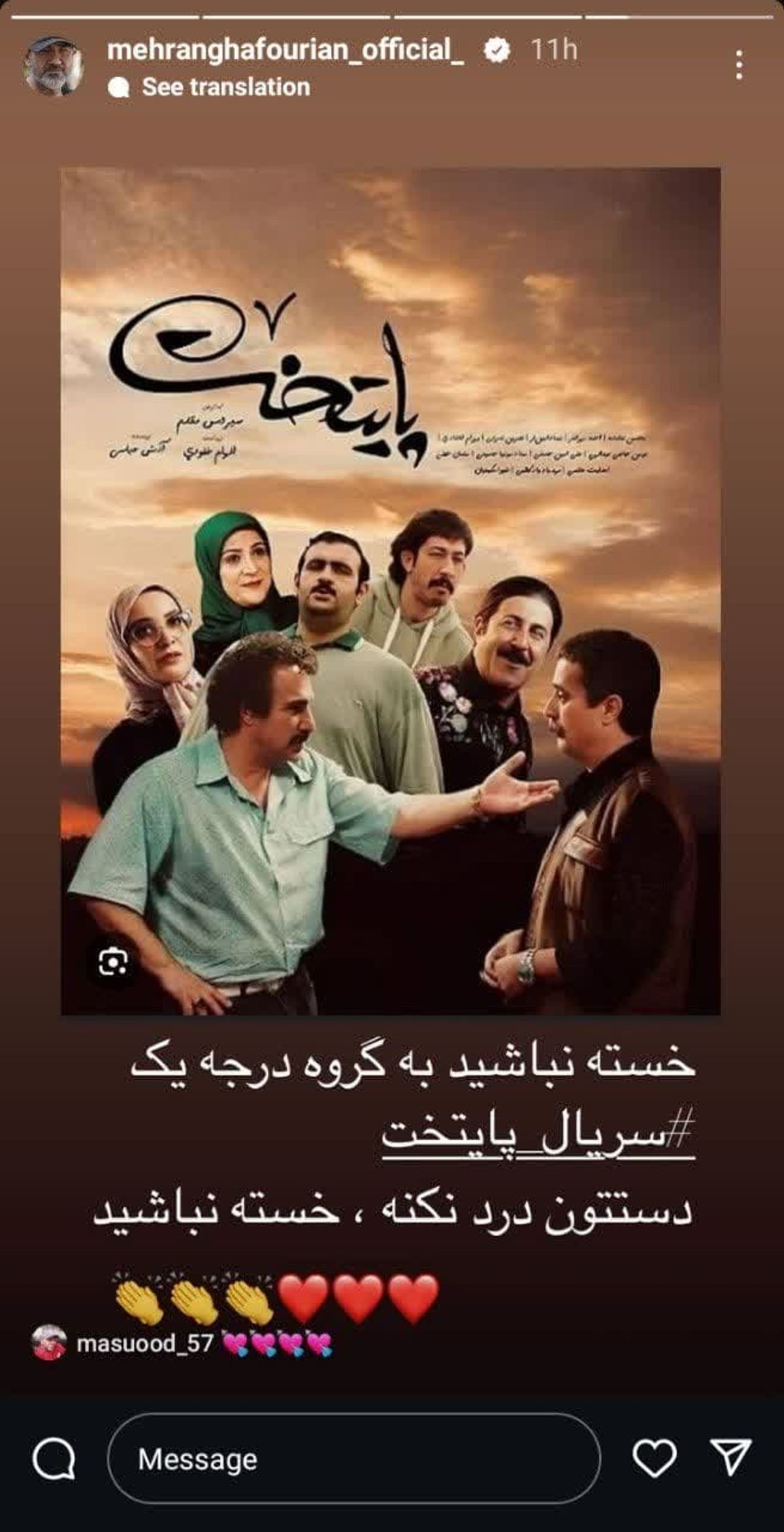 مهران غفوریان با انتشار استوری، از تیم سریال پایتخت بابت زحماتشان تقدیر و تشکر کرد.