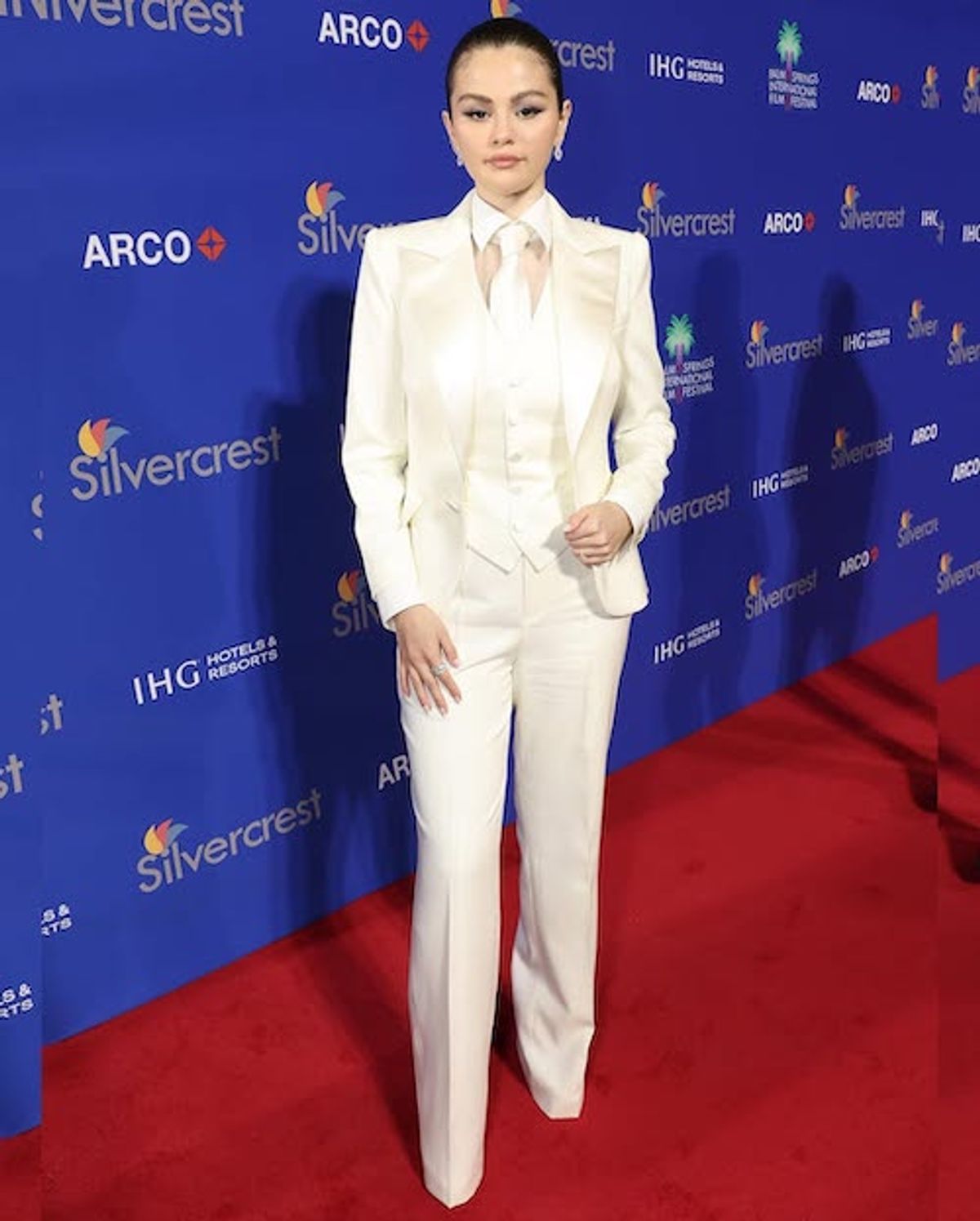 او در این مراسم با کت و شلوار سفید همراه با جلیقه و کراواتی به همین رنگ ظاهر شد که بهطور زیبایی اندام لاغر و متناسب او را به نمایش گذاشت. این استایل کلاسیک، بهویژه به خاطر انتخاب کراوات سفید، ظاهری منحصر به فرد و برجسته داشت و باعث شد که اندام لاغر و تراشیده او به وضوح دیده شود. سلینا در این مراسم نه تنها با انتخاب پوشش خاص خود توجهها را به خود جلب کرد، بلکه این استایل شیک و مدرن نشاندهنده تغییرات فیزیکی او بود که باعث شد ظاهری شگفتانگیز و اعتماد به نفس بالایی را از خود به نمایش بگذارد.