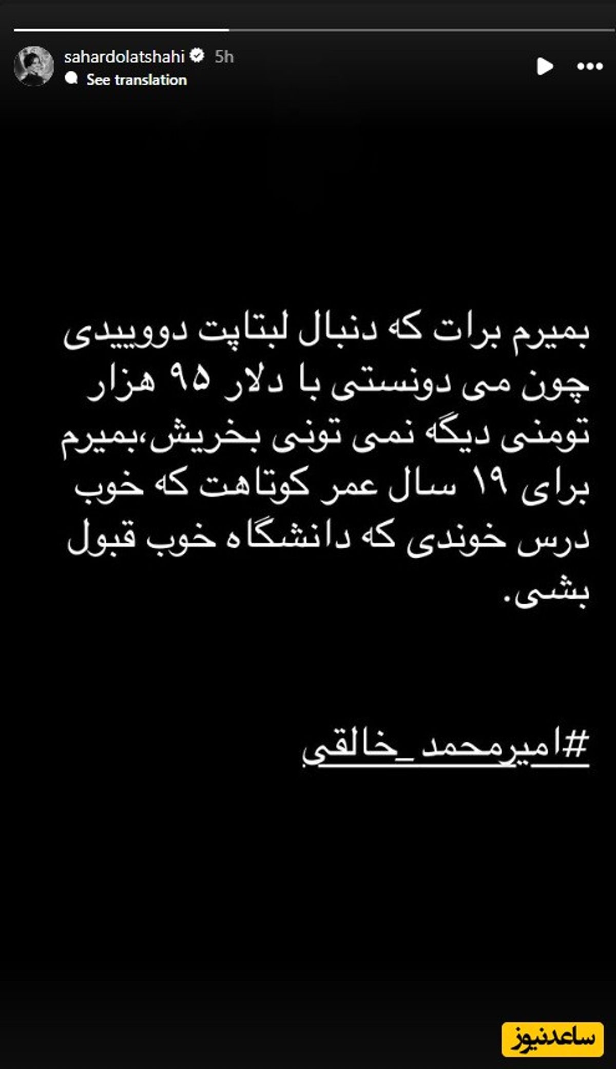 سحر دولتشاهی، بازیگر سینما و تلویزیون، در واکنش به درگذشت امیرمحمد خالقی، دانشجوی نخبه دانشگاه تهران، استوری احساسیای منتشر کرد. او نوشت: «بمیرم برات که دنبال لپتاپ دویدی، چون میدونستی که با دلار 95 هزار تومانی دیگه نمیتونی بخریش. بمیرم برای 19 سال عمر کوتاهت که خوب درس خوندی که دانشگاه خوب قبول بشی...»