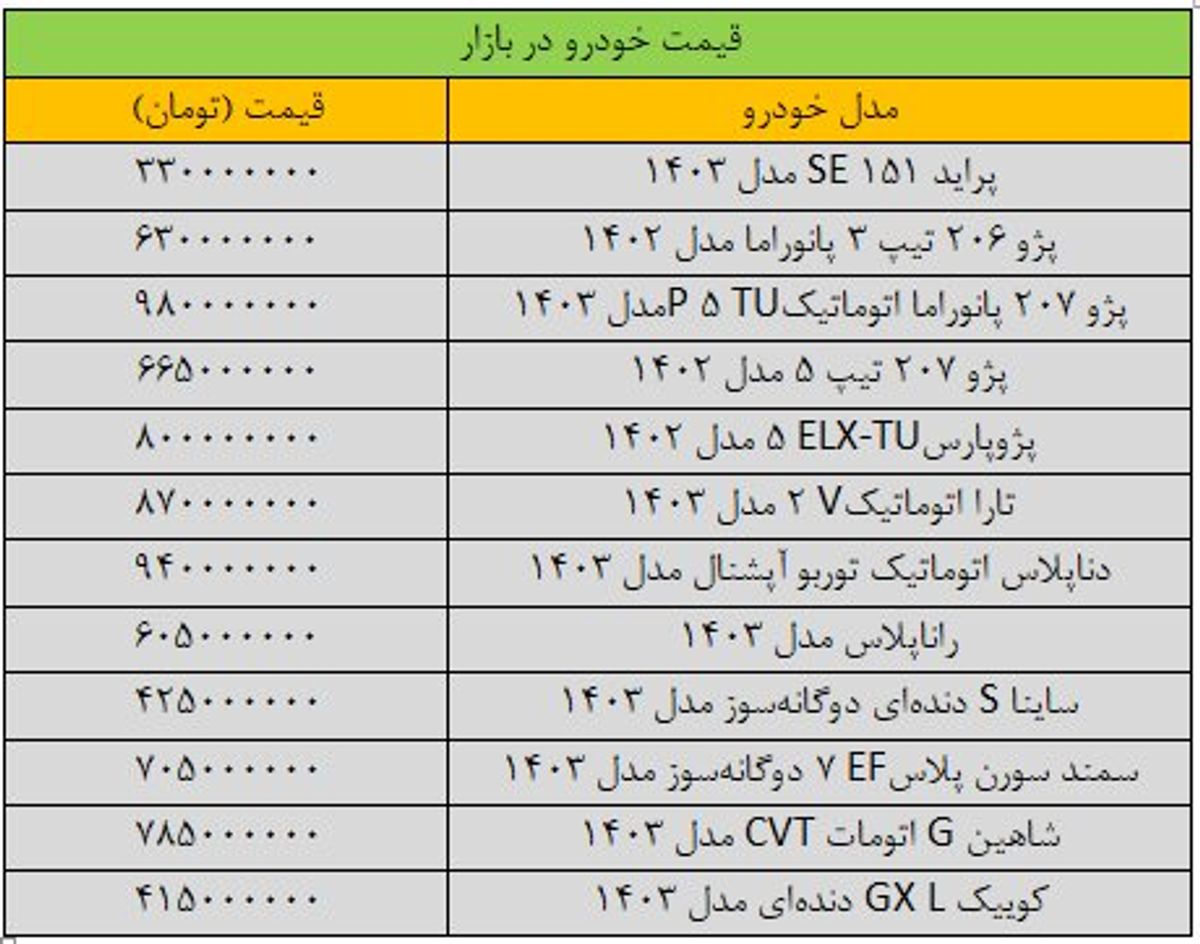 قیمت خودرو امروز شنبه 24 شهریور 1403 | پراید، پژو و تارا ارزان شدند +جدول