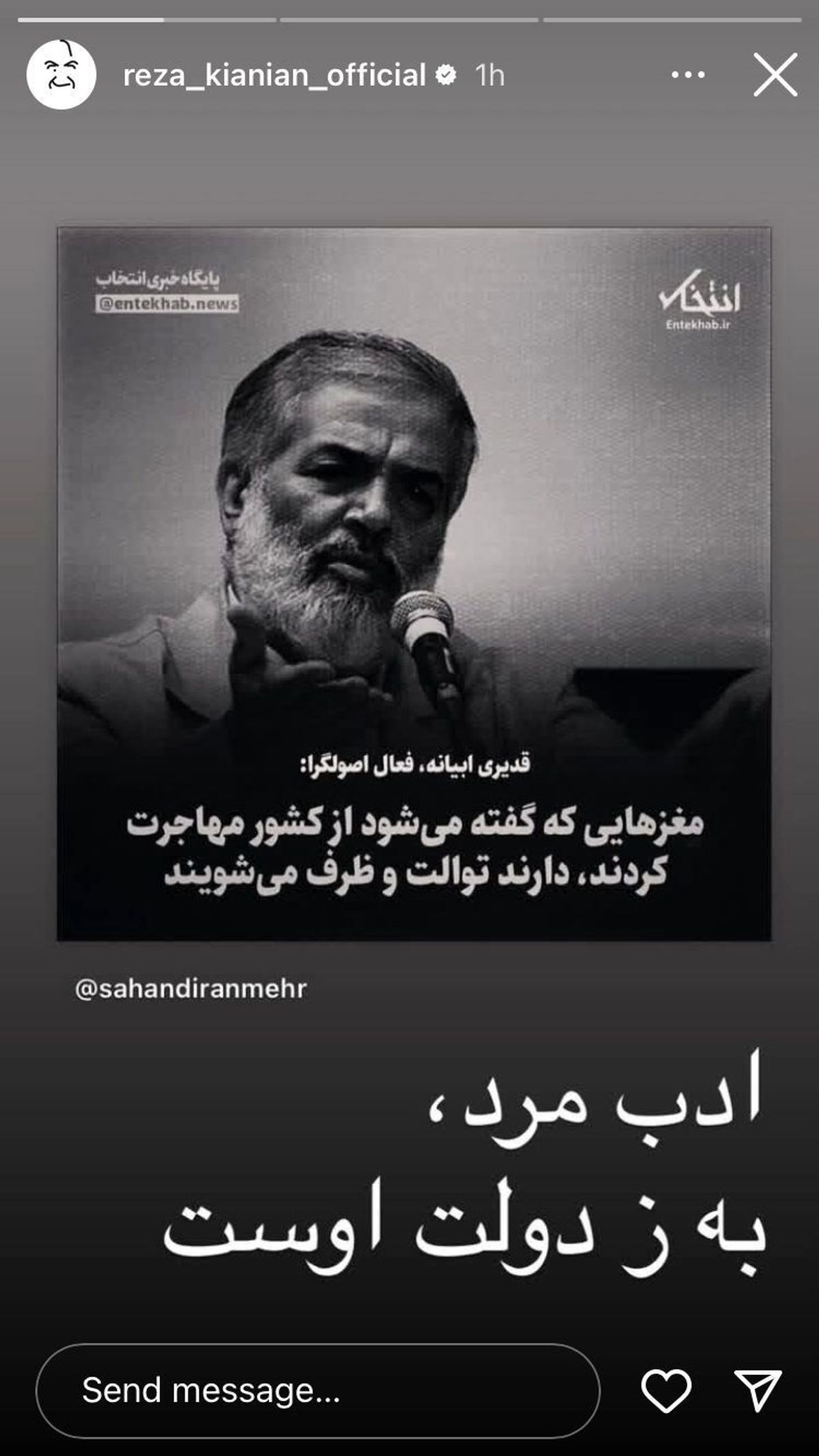 رضا کیانیان، بازیگر شناخته شده به صحبتهای قدیری ابیانه، فعال سیاسی اصولگرا درباره مهاجرت جوانان واکنش انتقادی نشان داد.
