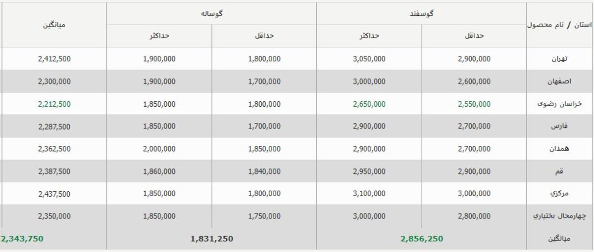 گزارشها نشان میدهد که در استان تهران هر کیلو گوسفند زنده حداقل ۲۹۰ هزار تومان و حداکثر ۳۰۵ هزار تومان قیمت دارد. هر کیلو گوساله زنده نیز بین ۱۸۰ تا ۱۹۰ هزار تومان به فروش میرود.