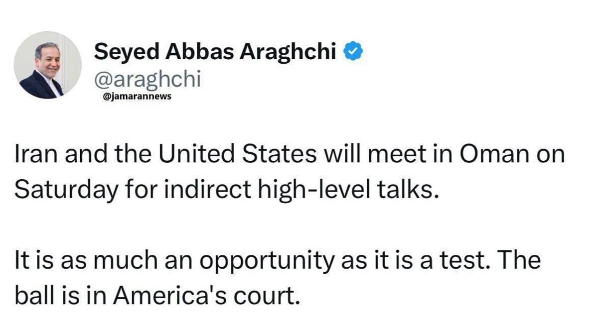 او در این زمینه نوشت: ایران و آمریکا روز شنبه در عمان برای گفتوگوهای غیرمستقیم در سطح مقامات عالی ملاقات خواهند کرد. این دیدار به همان اندازه که یک فرصت است، یک آزمون هم هست. توپ در زمین آمریکاست.