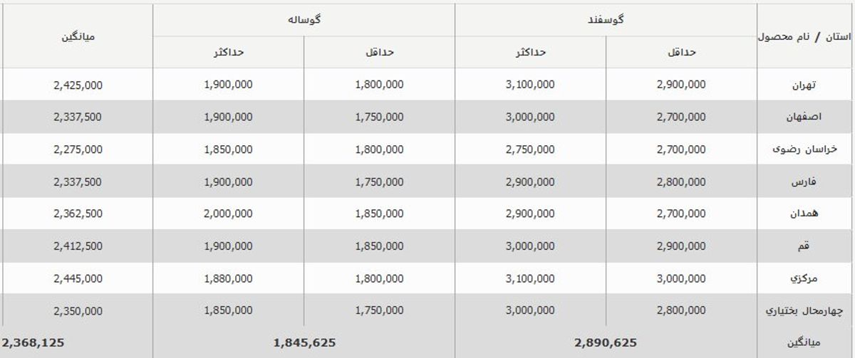 گزارشها نشان میدهد که در استان تهران هر کیلو گوسفند زنده حداقل ۲۹۰ هزار تومان و حداکثر۳۱۰ هزار تومان قیمت دارد. هر کیلو گوساله زنده نیز بین ۱۸۰ تا ۱۹۰ هزار تومان به فروش میرود.