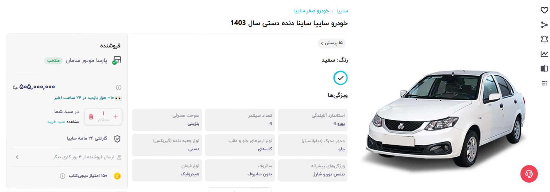 ساینا دندهای مدل ۱۴۰۳ ارزانترین خودرو در دیجیکالاست و ۵۰۵ میلیون تومان برای فروش گذاشته شده است. اسم خودرو ساینا دندهای مدل ۱۴۰۳ قید شده، اما احتمالا منظور دیجیکالا ساینا دندهای تیپ S است که با پسوند استانداردهای ۸۵ گانه در فهرست محصولات سایپا قرار میگیرد.