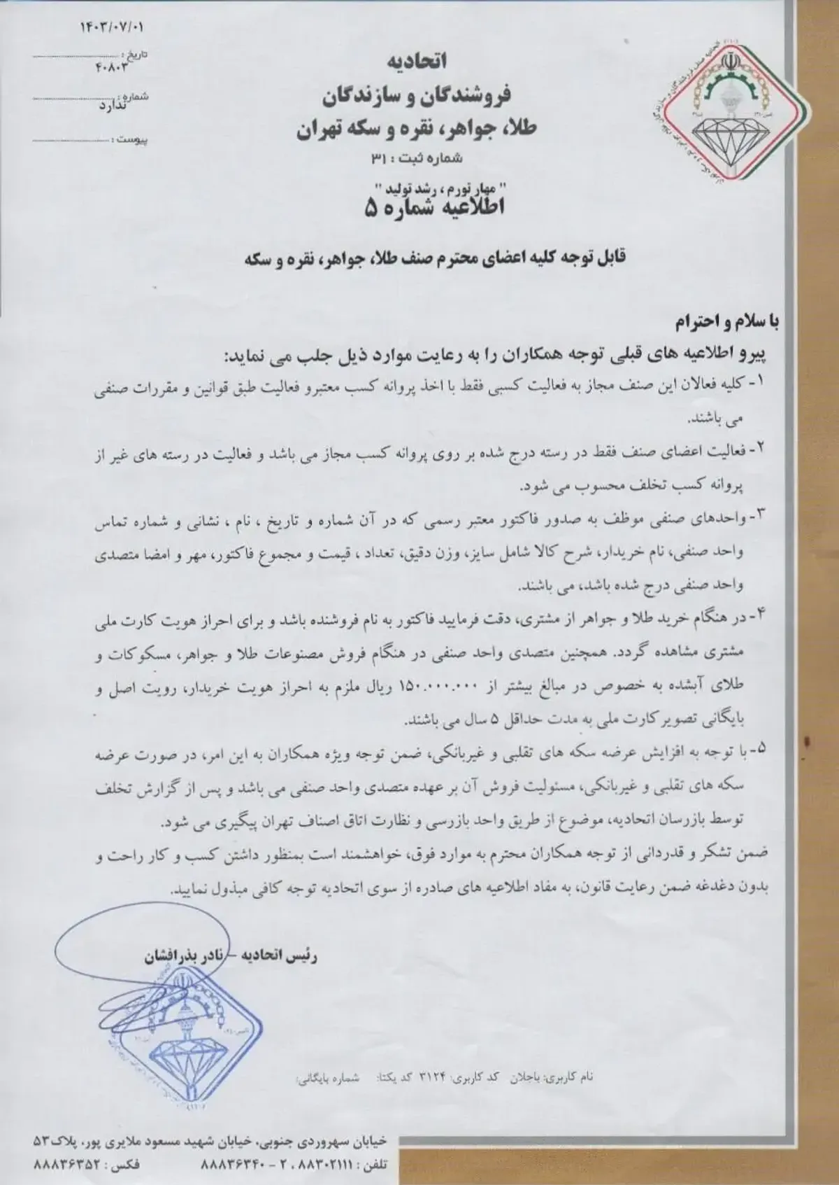 نادر بذرافشان رئیس اتحادیه فروشندگان و سازندگان طلا، جواهر، نقره و سکه تهران در نامهای به فعالان این صنف اعلام کرد که واحد صنفی هنگام فروش مصنوعات طلا و جواهر مسکوکات و طلای آب شده به خصوص در مبالغ بیش از 150.000.000 ریال ملزم به احراز هویت خریدار، رؤیت اصل و بایگانی تصویر کارت ملی به مدت حداقل 5 سال است.
