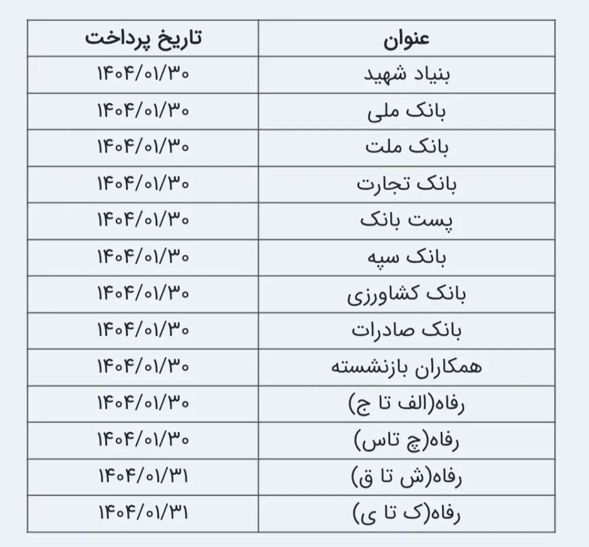 براساس این گزارش، زمانبندی پرداخت حقوق فروردین بازنشستگان، مطابق جدول زیر است: