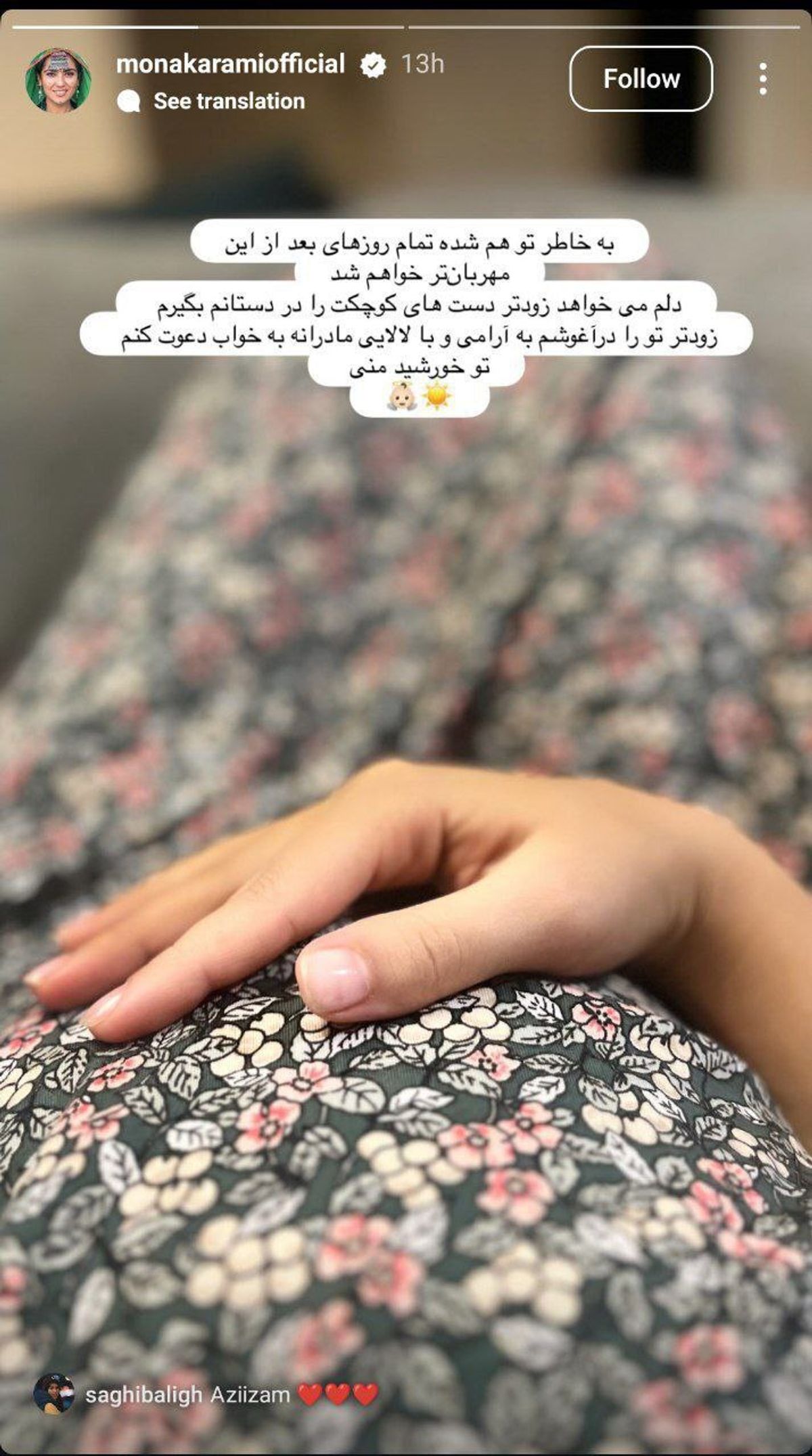 مونا کرمی، همسر سپند امیرسلیمانی با انتشار یک استوری در اینستاگرام برای فرزندش نوشت: به خاطر تو هم شده تمام روزهای بعد از این مهربان تر خواهم شد.....