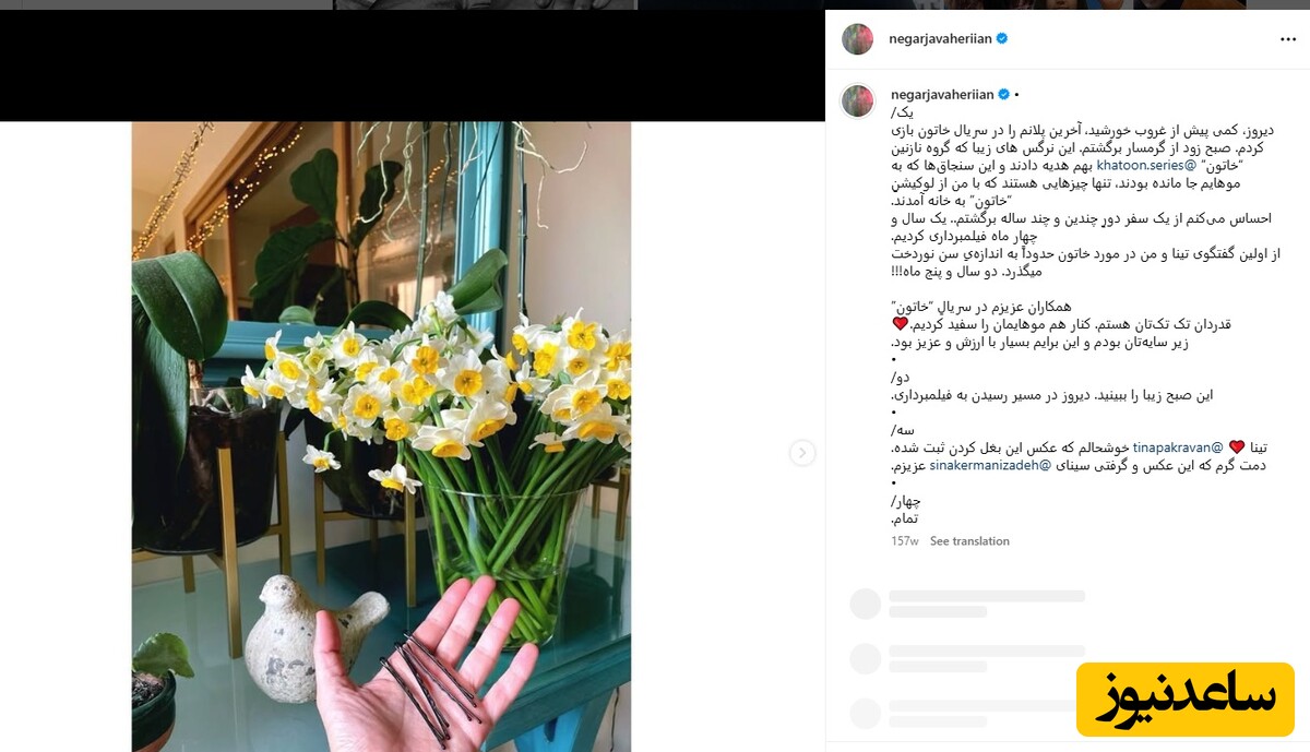 تصویر زیر را نگار جواهریان از منزلش در اینستاگرام منتشر کرده است: