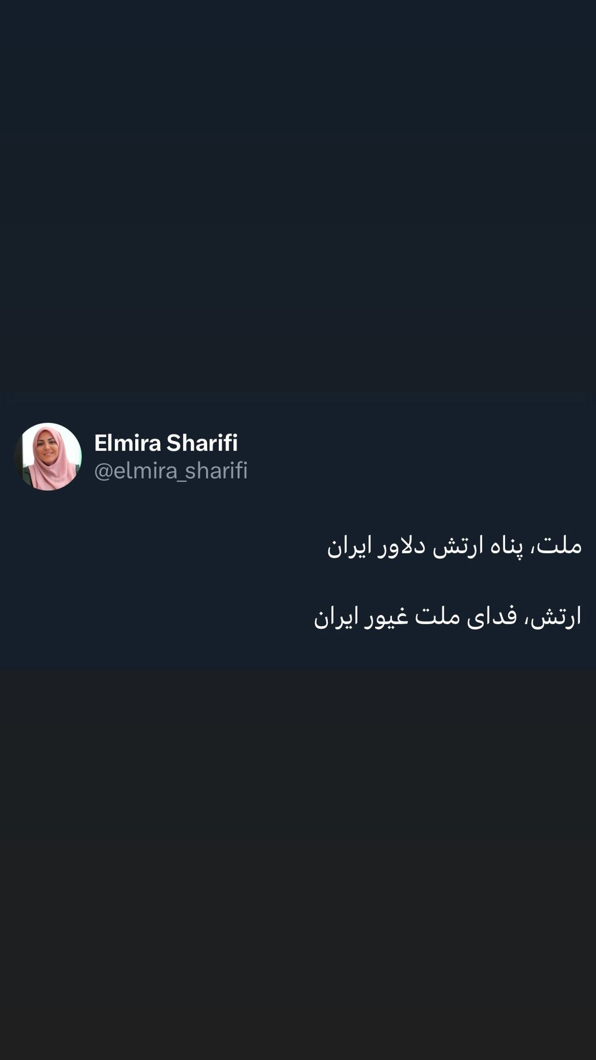 المیرا شریفی مقدم بعد از حمله اسرائیل به ایران نوشت: ملت پناه ارتش دلاور ایران.....