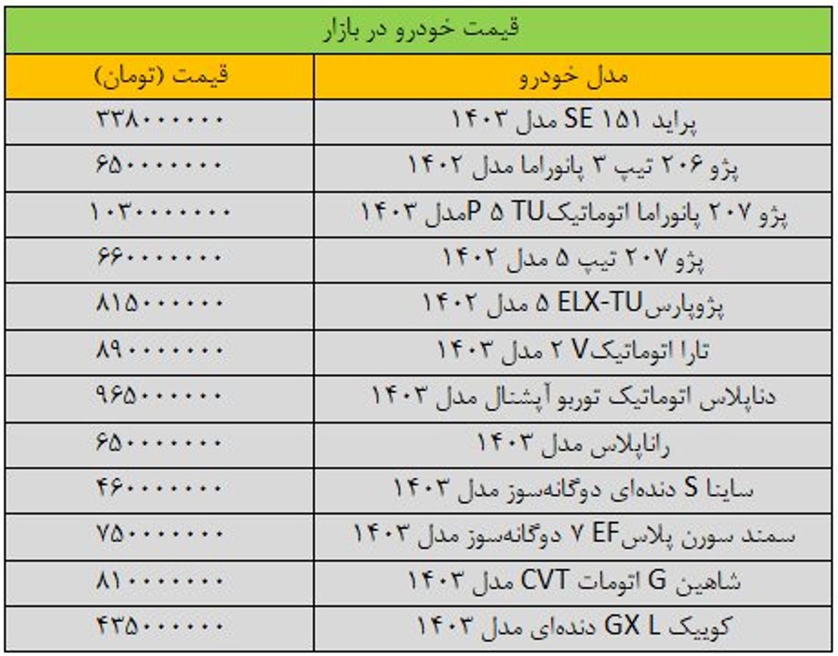 در این میان، پژو ۲۰۷ TU۳ مدل ۱۴۰۳ در بازار خودرو ۶۴۵ میلیون تومان قیمت خورد. پژوپارس XU۷P مدل ۱۴۰۳ هم ۵ میلیون تومان ارزان شد و ۷۰۰ میلیون تومان به فروش رفت.