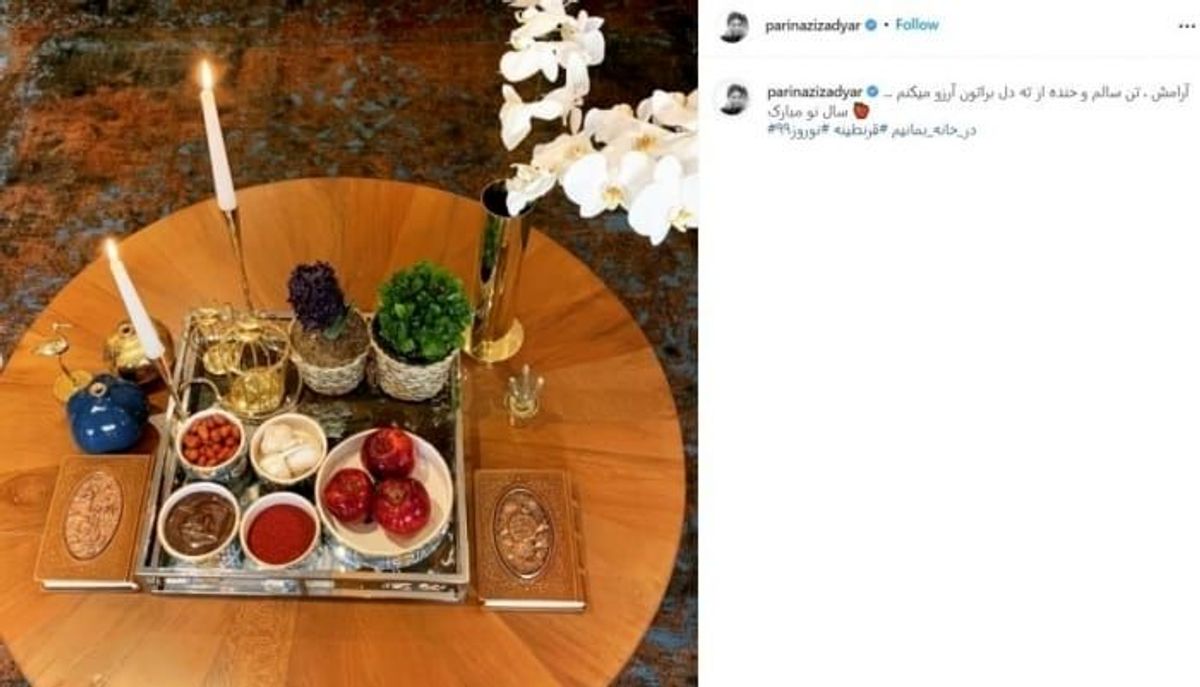 تو این عکس، مدل سفره هفت سین پریناز ایزدیار، یکی از نقش اصلی های سریال جیران رو می بینید. یه هفت سین شیک با ترکیب سبک مدرن و سنتی که مثل نقش آفرینی های پریناز، دلنشین و زیباست.