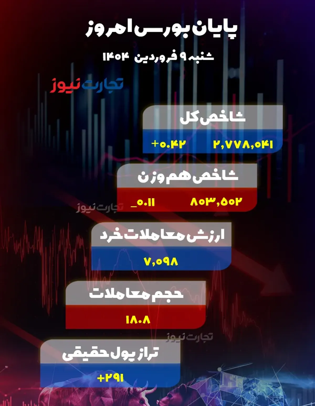 گفتنی است تابلو بورس اوراق بهادار تهران در روز جاری، حجم معاملات را 18.8 میلیارد برگه سهم و ارزش معاملات خرد (سهام، حق تقدم و صندوقهای سهامی) را هفت هزار و 98میلیارد تومان نشان میدهد. امروز همچنین 291 میلیارد تومان پول حقیقی وارد بازار شد.