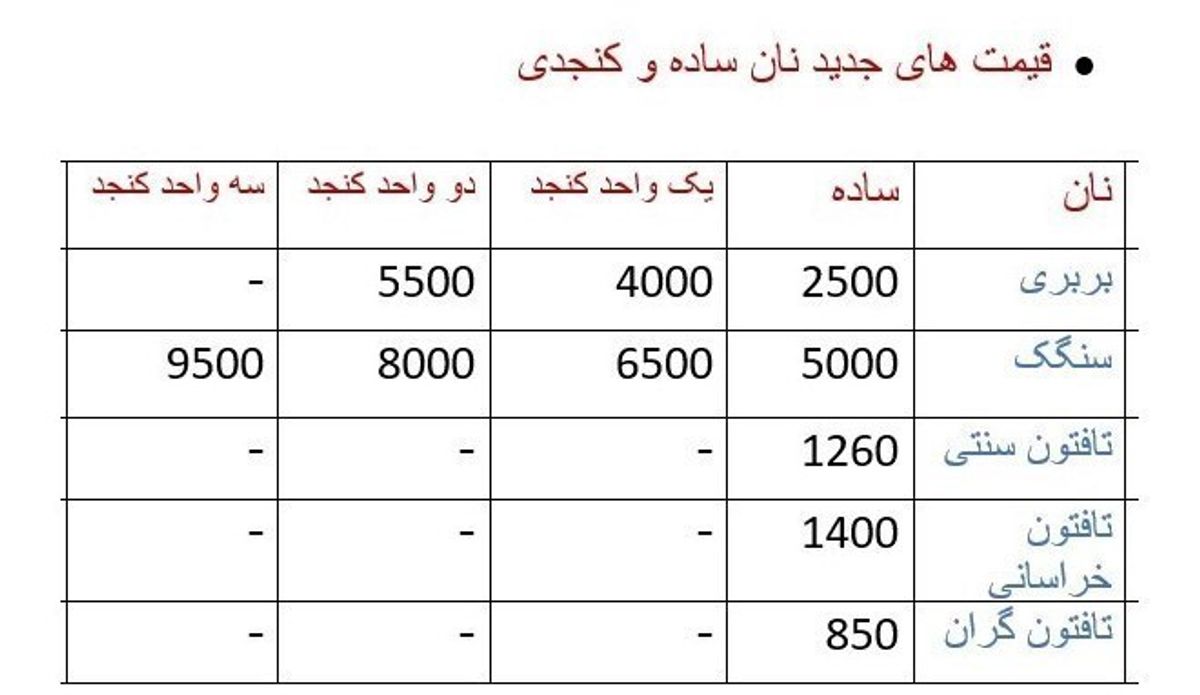 بر اساس قیمت های مصوب جدید نان که اخیرا ابلاغ شده، نان سنگک ساده 5 هزار تومان، بربری ساده با آرد نوع یک، 2 هزار و پانصد تومان و بربری ساده با آرد نوع دو 3 هزار و پانصد تومان، نان لواش با آرد نوع یک 700 تومان و لواش نوع دو 900تومان، نان سنتی تافتون با آرد نوع 1260 تومان و نوع دو 1500 تومان نان ماشینی تافتون با آرد نوع یک 850 تومان و نوع دو، 1200 تومان تعیین شده است.