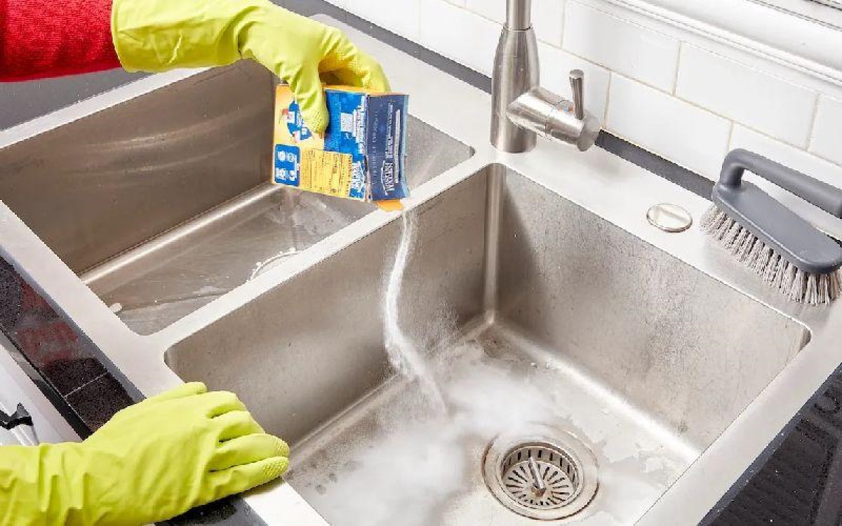 - جوش شیرین و سرکه: جوش شیرین را در سینک بپاشید و سپس سرکه را روی آن بریزید. بگذارید چند دقیقه دم بکشد، سپس با برس یا اسفنج به همراه آب بشویید.
