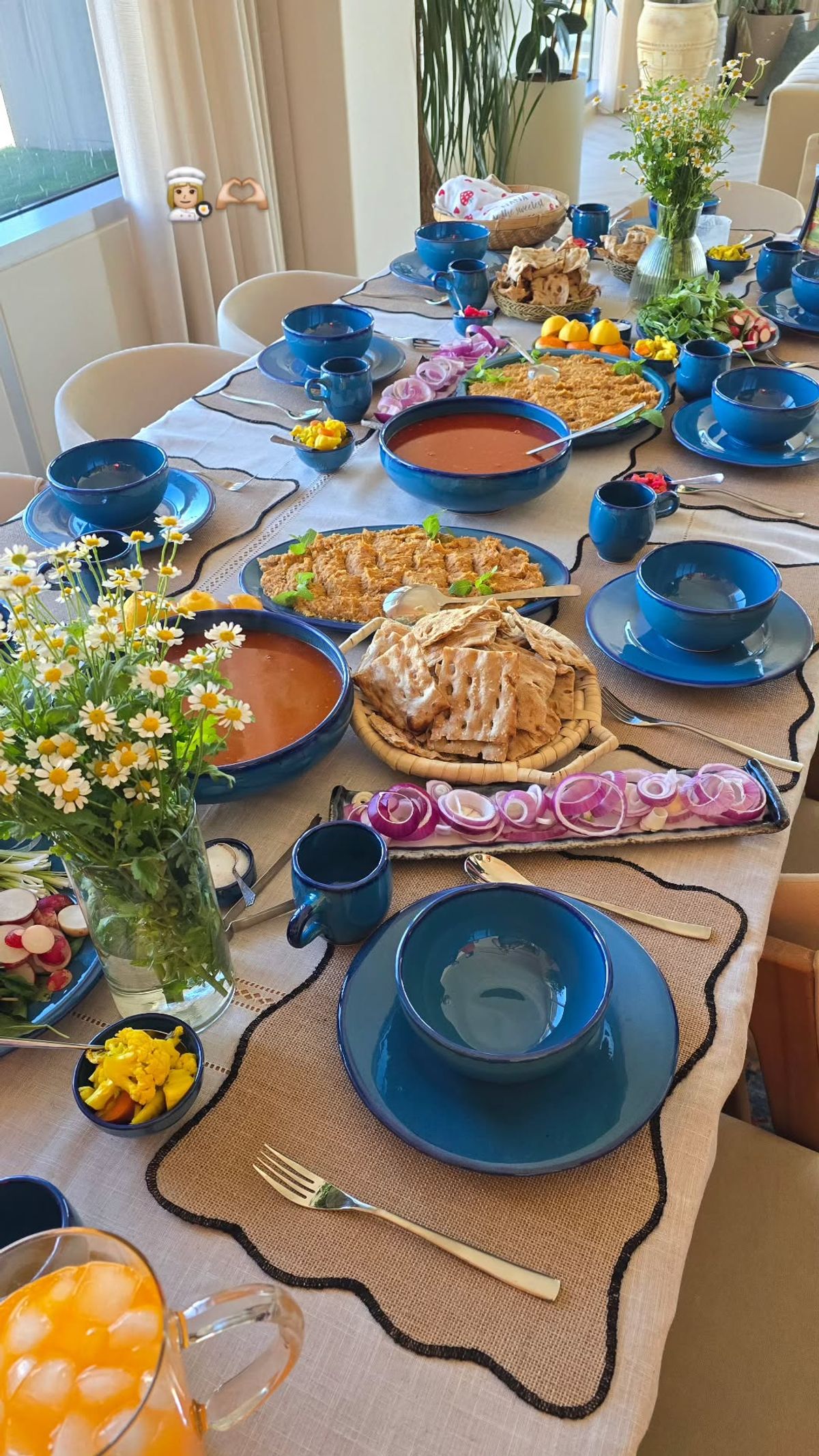پذیرایی مینا مختاری از مهمانانش با آبگوشت اعیانی؛ دیزاین میز غذای مینا مختاری با کاسه های سفالی آبی فیروزه ای با گل بابونه