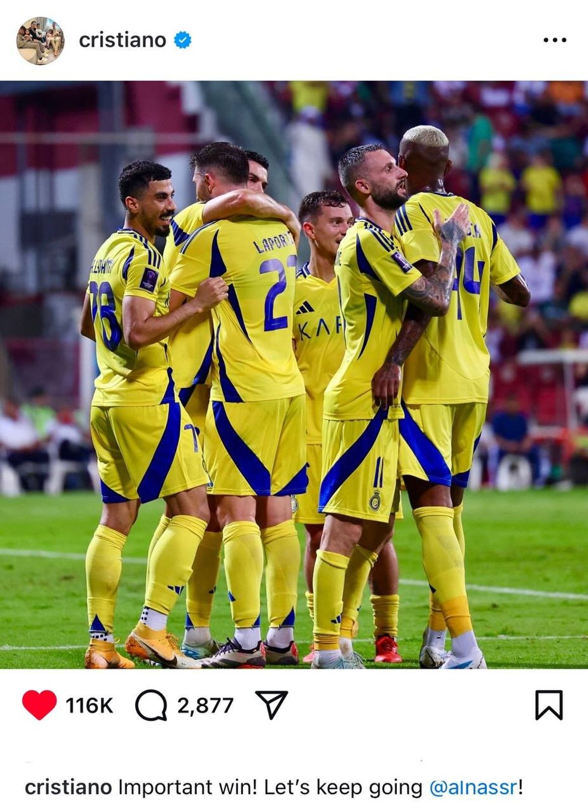 کریستیانو رونالدو، ستاره النصر پس از بازی پستی در صفحه شخصی خود منتشر کرد و نوشت: «برد مهم؛ روبه جلو!»