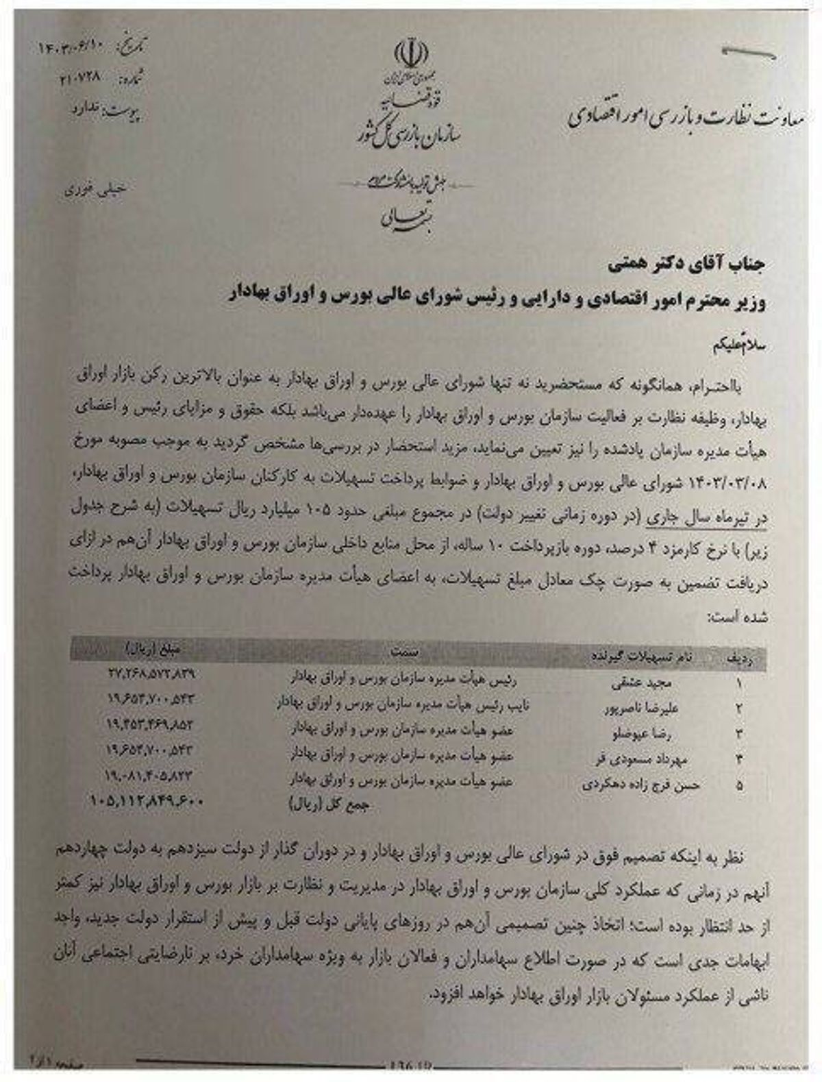 به گزارش شرق، به تازگی نامهای به تاریخ ۱۰ شهریور از سازمان بازرسی به عبدالناصر همتی وزیر اقتصاد منتشر شده است که نشان میدهد شورای عالی بورس و اوراق بهادار در تیر ماه سال جاری پرداخت وام و تسهیلات را به کارکنان سازمان بورس و اوراق بهادار با نرخ ۴ درصد بازگشت ۱۰ساله از محل منابع داخلی سازمان بورس و اوراق بهادار به تصویب رسانده است.